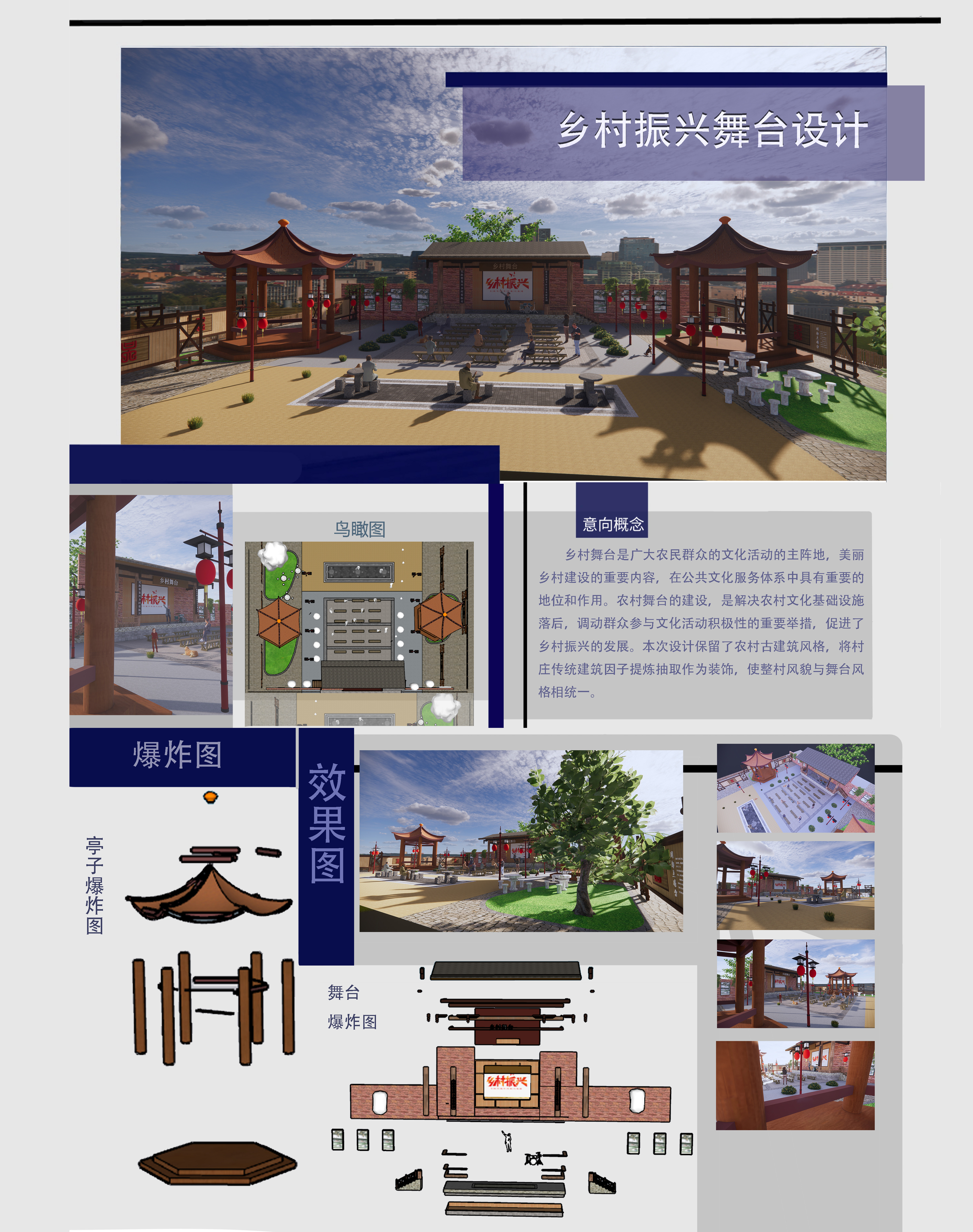 乡村舞台是广大农民群众的文化活动的主阵地,美丽乡村建设的重要内容,在公共文化服务体系中具有重要的地位和作用。我们在传统的建筑上增加了想多创新点,舞台和广场面积增大适合演员更好的表演和容纳更多的观众,天棚之下为一个通透的开放空间,中间抬高形成视觉焦点,也便于演出等活动展开,台上两侧升起变为亭子,非演出时在台上活动的村民可以围坐聊天。