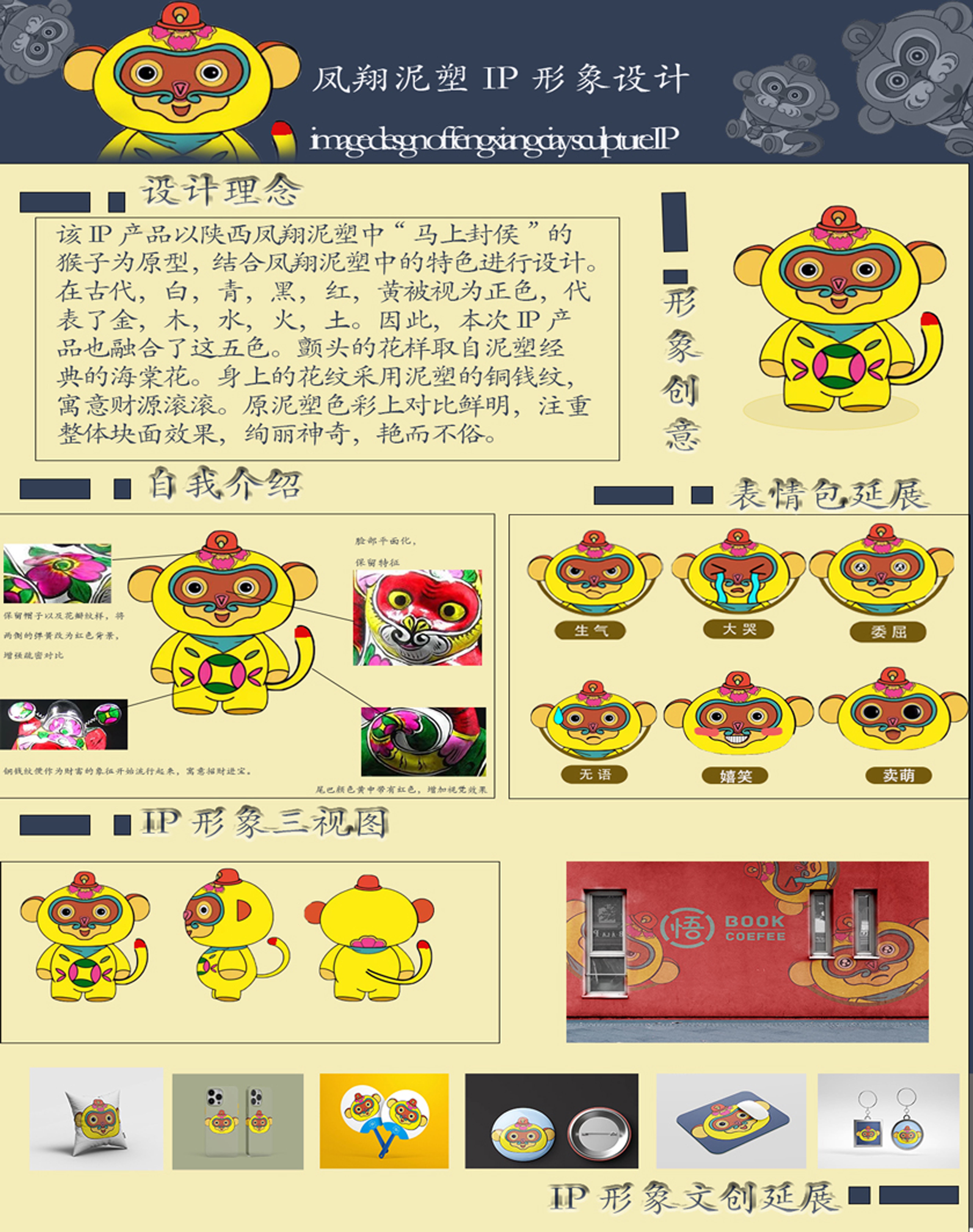 该IP产品以陕西凤翔泥塑中“马上封侯”的猴子为原型结合凤翔泥塑中的特色进行设计。在古代,白,青,黑,红,黄被视为正色,代表了金,木,水,火,土。因此,本次IP产品也融合了这五色。颤头的花样取自泥塑经典的海棠花。身上的花纹采用泥塑的铜钱纹,寓意财源滚滚。原泥塑色彩上对比鲜明注重整体块面效果绚丽神奇,艳而不俗。