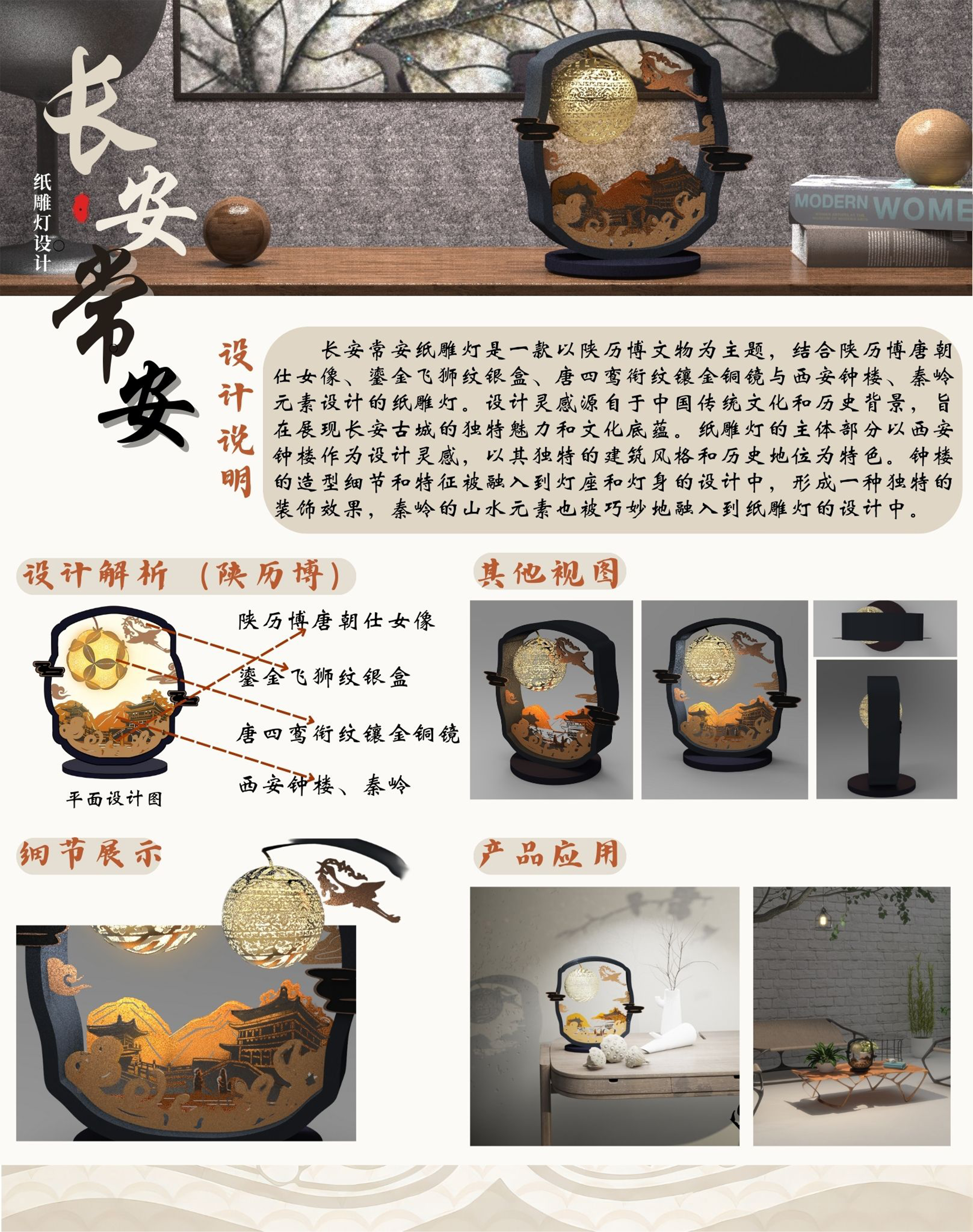 长安常安纸雕灯是一款以陕历博文物为主题,结合陕历博唐朝仕女像、鎏金飞狮纹银盒、唐四鸾衔纹镶金铜镜与西安钟楼、秦岭元素设计的纸雕灯。设计灵感源自于中国传统文化和历史背景,旨在展现长安古城的独特魅力和文化底蕴。纸雕灯的主体部分以西安钟楼作为设计灵感,以其独特的建筑风格和历史地位为特色。钟楼的造型细节和特征被融入到灯座和灯身的设计中,形成一种独特的装饰效果,秦岭的山水元素也被巧妙地融入到纸雕灯的设计中。