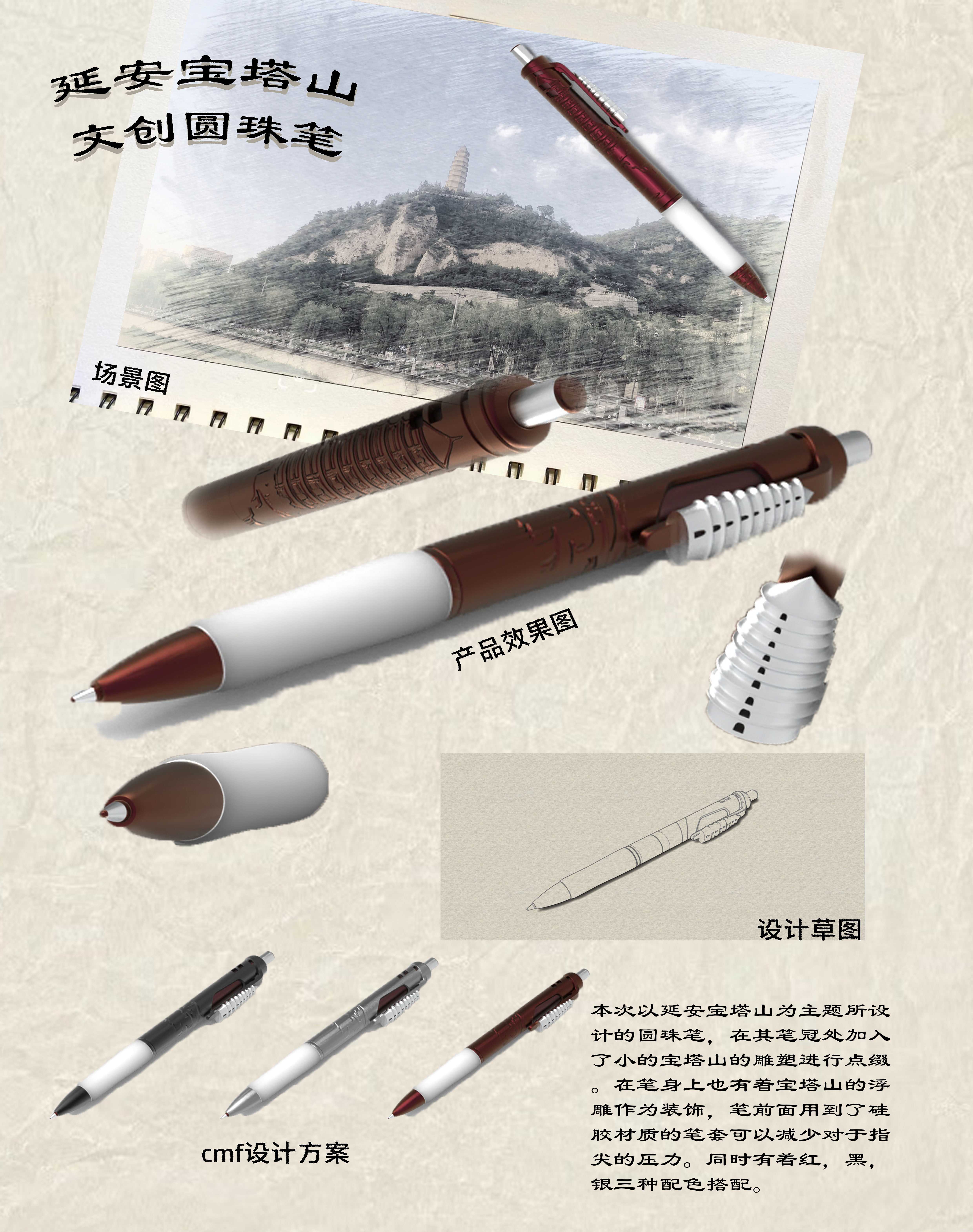 本次以延安宝塔山为主题所设计的圆珠笔,在其笔冠处加入了小的宝塔山的雕塑进行点缀。在笔身上也有着宝塔山的浮雕作为装饰,笔前面用到了硅胶材质的笔套可以减少对于指尖的压力。同时有着红,黑,银三种配色搭配。