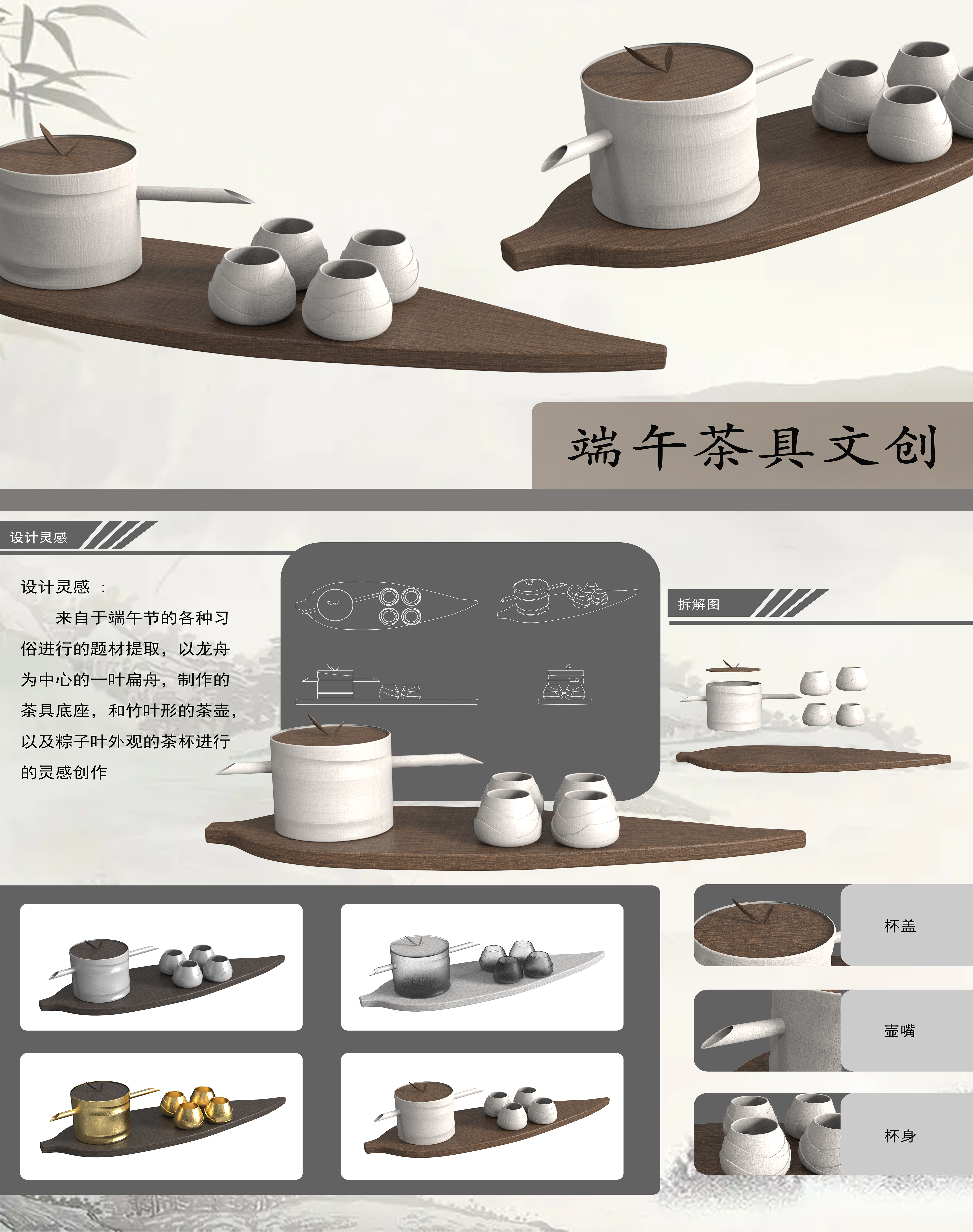 设计说明:来自于端午节的各种习俗进行的题材提取,以龙舟为中心的一叶扁舟,制作的茶具底座,和竹叶形的茶壶,以及粽子叶外观的茶杯进行的灵感创作