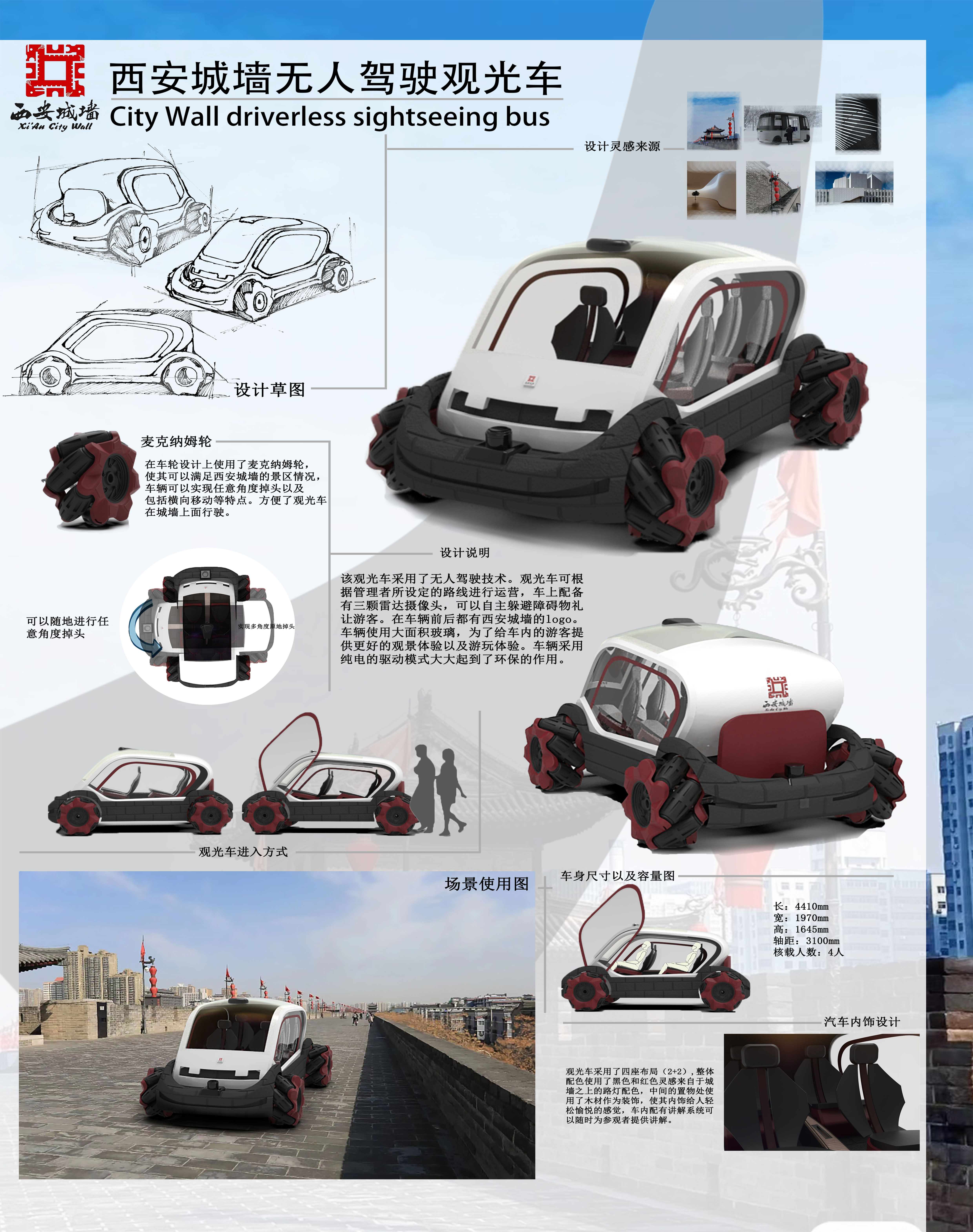 观光车可根据管理者所设定的路线进行运营,该车采用四座布局,在车内配备有自主讲解系统可以根据车辆运营位置实时讲解。在车轮设计上使用了麦克纳姆轮,使其可以满足西安城墙的景区情况,车辆可以实现任意角度掉头以及包括横向移动等特点。车外包围使用了砖块设计语言使其更加符合西安城墙的主题。在车辆前后都有西安城墙的logo。车辆使用大面积玻璃,为了给车内的游客提供更好的观景体验以及游玩体验。
