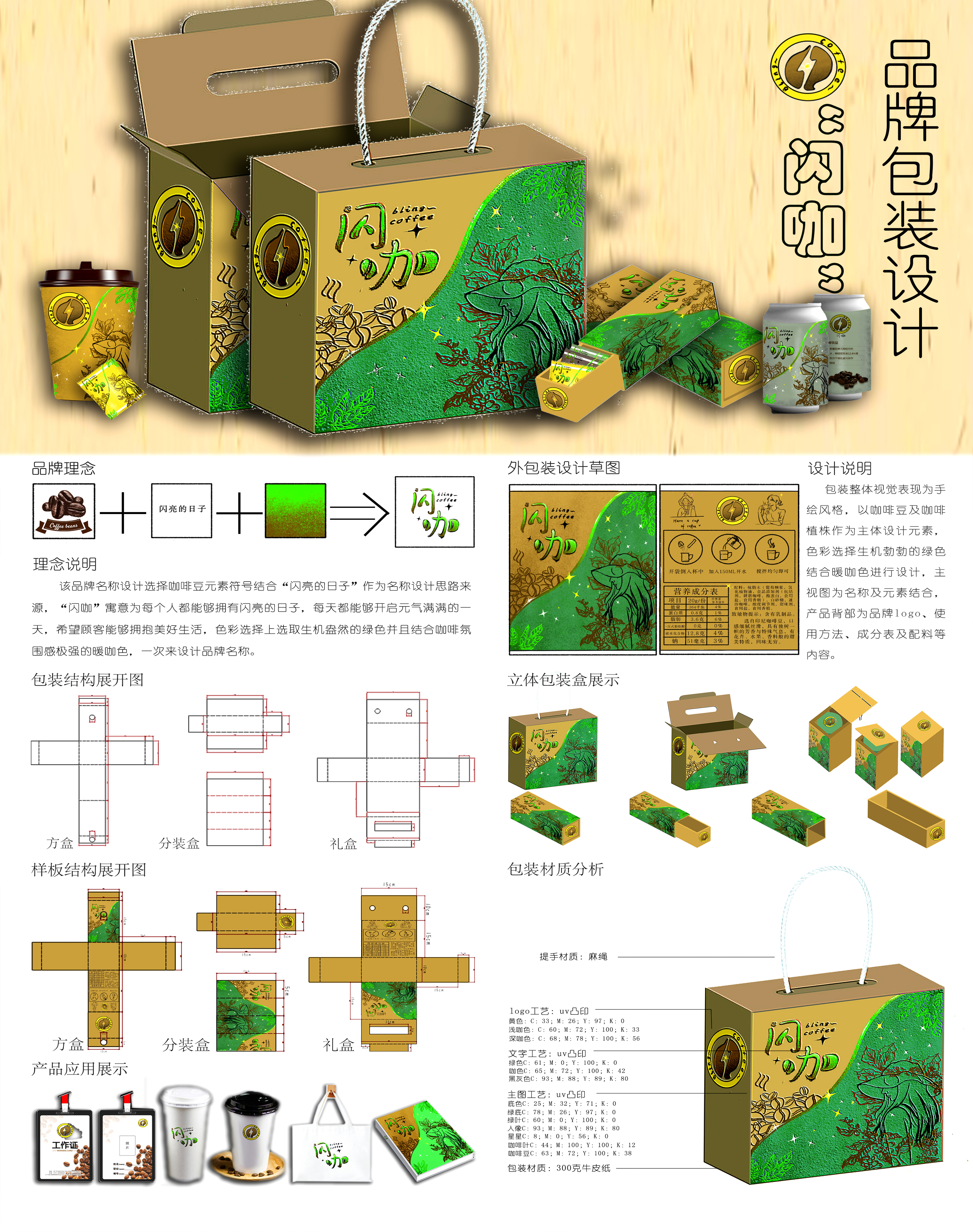包装整体视觉表现为手绘风格,以咖啡豆及咖啡植株作为主体设计元素,色彩选择生机勃勃的绿色结合暖咖色进行设计,主视图为名称及元素结合,产品背部为品牌logo、使用方法、成分表及配料等内容。