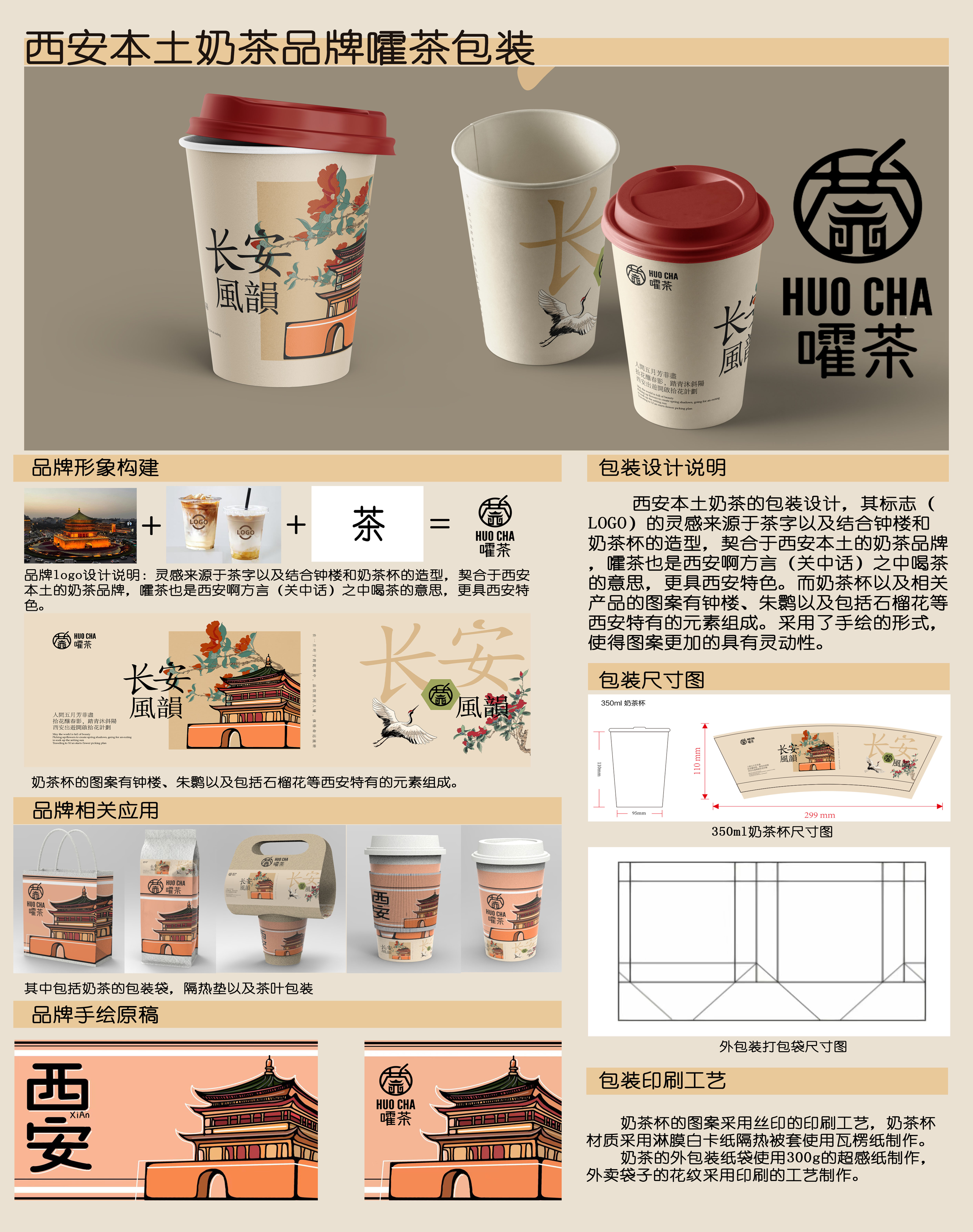西安本土奶茶的包装设计,其标志(LOGO)的灵感来源于茶字以及结合钟楼和奶茶杯的造型,契合于西安本土的奶茶品牌,嚯茶也是西安啊方言(关中话)之中喝茶的意思,更具西安特色。而奶茶杯以及相关产品的图案有钟楼、朱鹮以及包括石榴花等西安特有的元素组成。采用了手绘的形式,使得图案更加的具有灵动性。