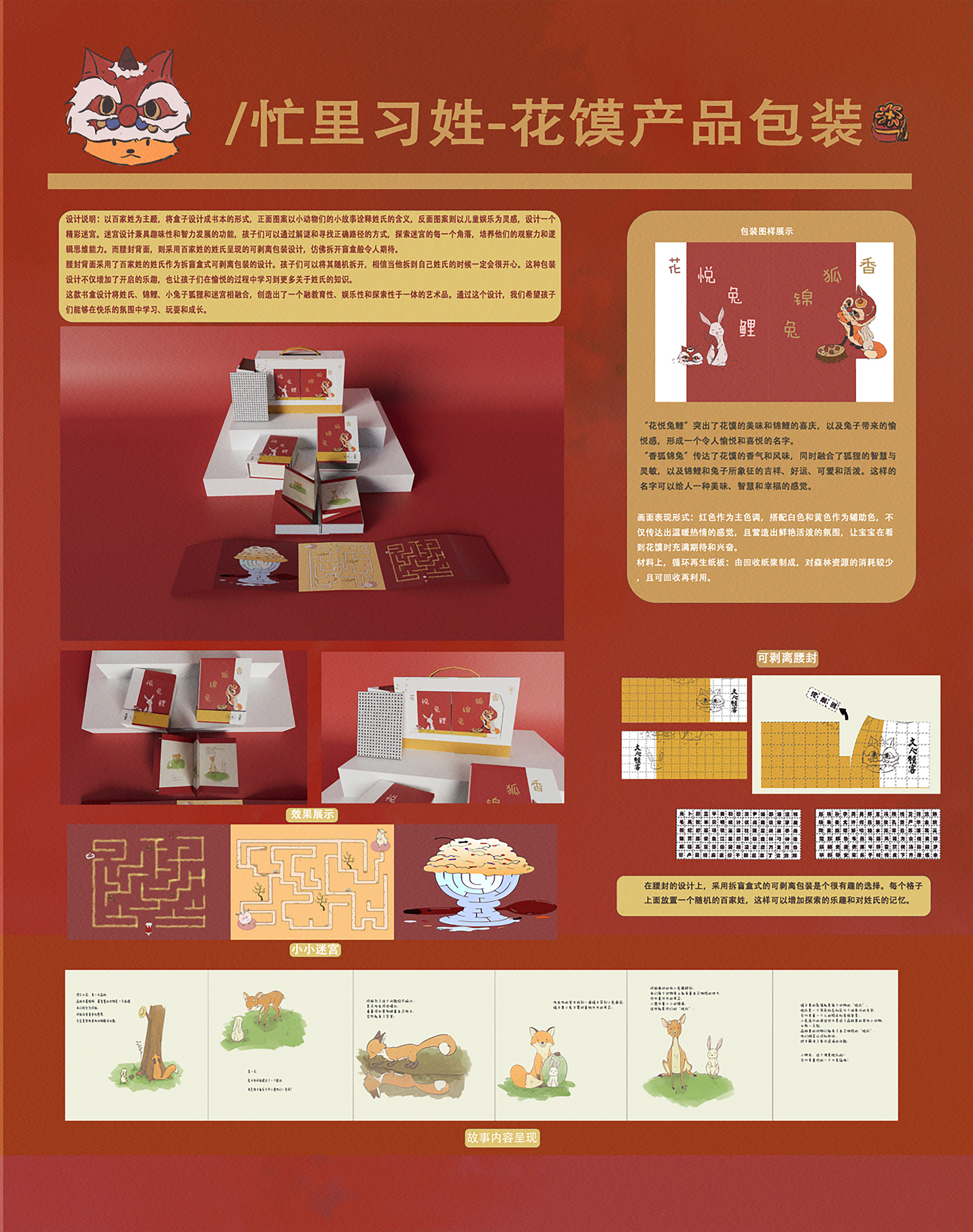 以百家姓为主题,将盒子设计成书本的形式,正面图案以小动物们的小故事诠释姓氏的含义,反面图案则以儿童娱乐为灵感,设计一个趣味迷宫。迷宫设计兼具趣味性和智力发展的功能,可以通过解谜和寻找正确路径的方式,探索迷宫的每一个角落,培养观察力和逻辑思维能力。而腰封背面,则采用百家姓的姓氏呈现可剥离式包装设计,仿佛拆开盲盒般令人期待。既增加了开启包装时的乐趣,也学习到更多关于姓氏的知识。