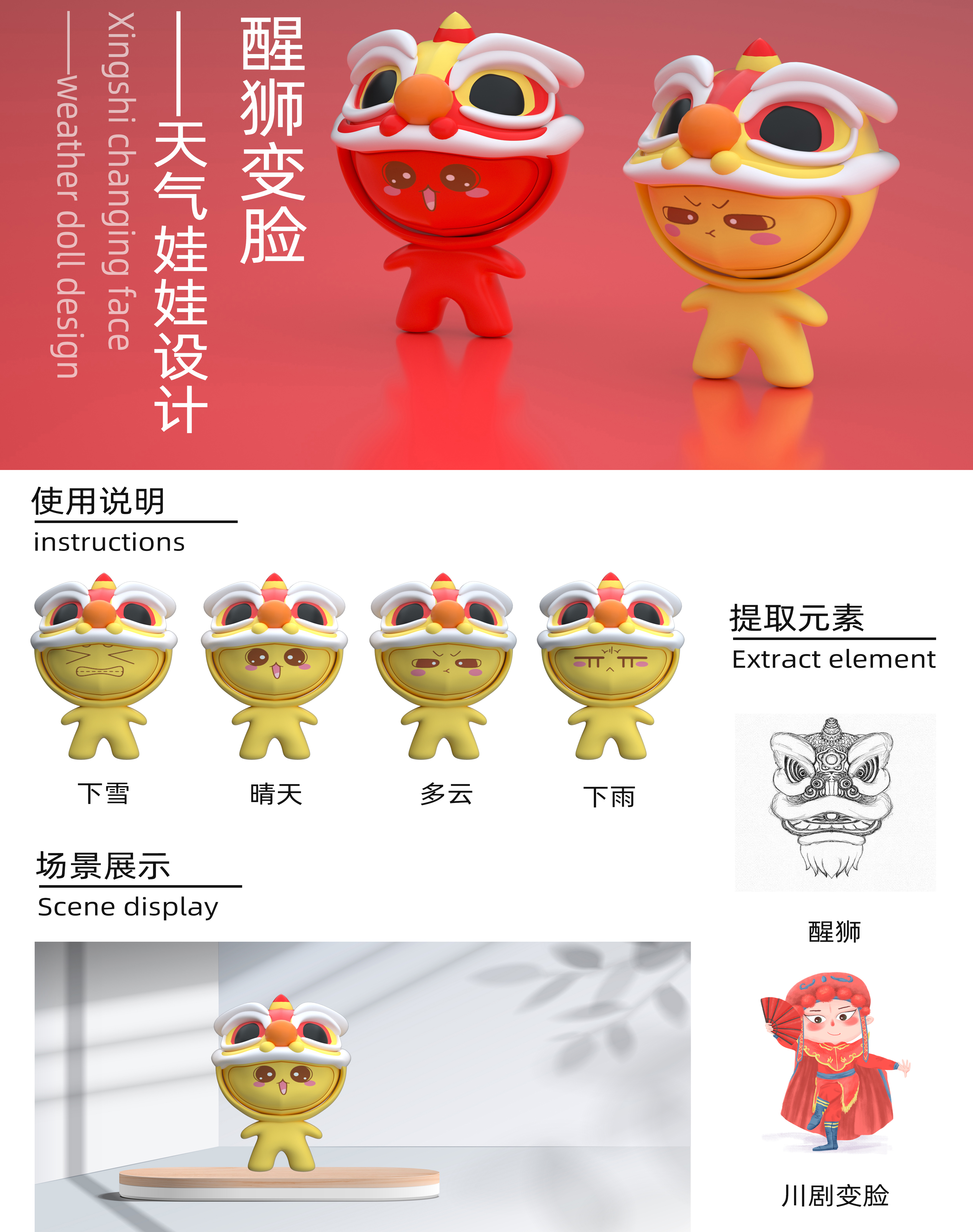 本产品结合了中国传统文化元素醒狮与川剧变脸,娃娃内部装有温度感应器,脸部可以似川剧变脸一样随天气变换而更换表情,不同的表情代表着不同的天气情况,用户既可以用它来查看当前的天气情况,又可以将其当作一个挂饰。