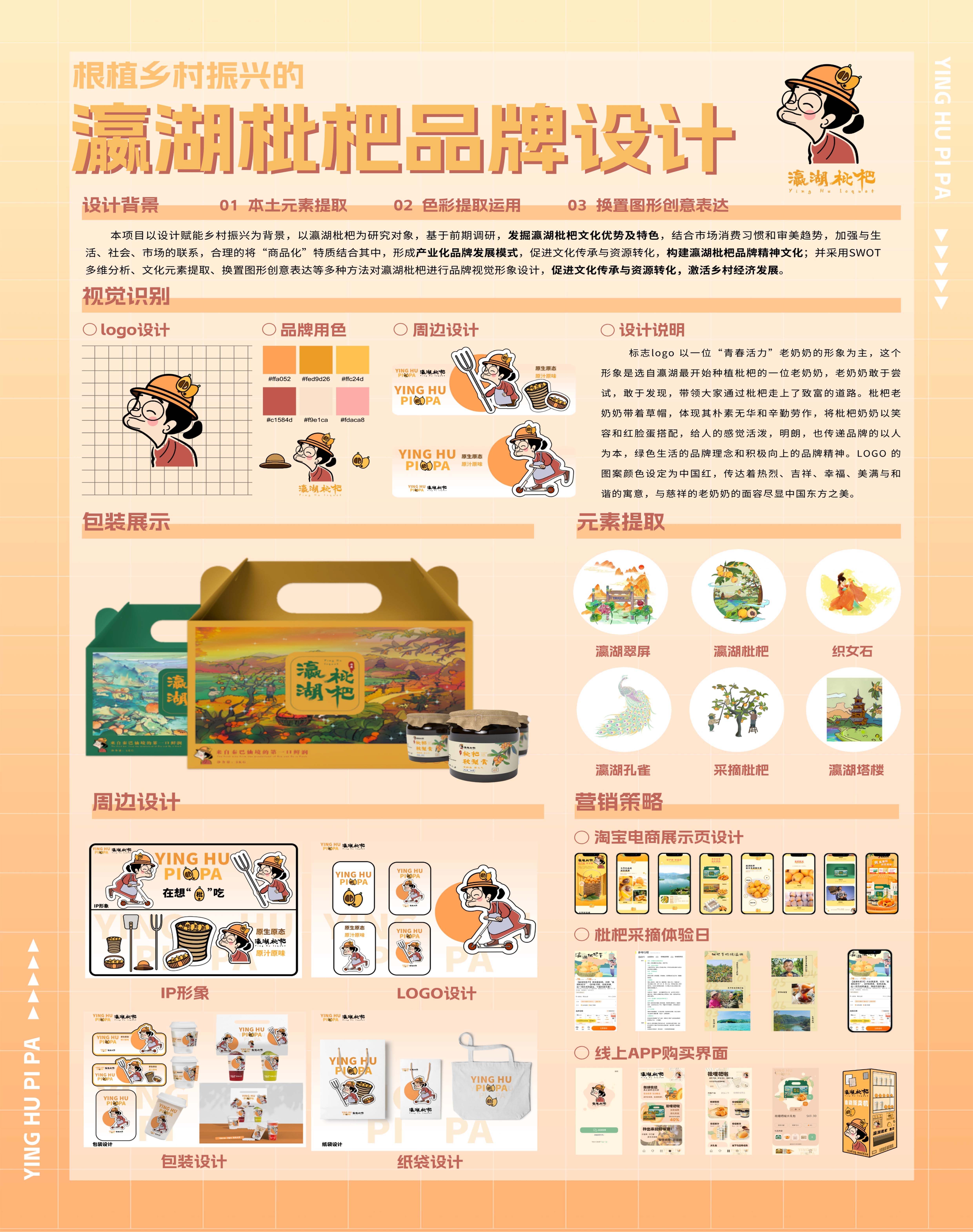本项目以设计赋能乡村振兴为背景,以瀛湖批把为研究对象,基干前期调研,发掘瀛湖批杷文化优势及特色,结合市场消费习惯和审美趋势。加强与生活、社会、市场的联系,合理的将“商品化”特质结合其中,形成产业化品牌发展模式,促进文化传承与资源转化,构建瀛湖批杷品牌精神文化:并采用SWOT多维分析、文化元素提取、换置图形创意表达等多种方法对瀛湖杷进行品牌视觉形象设计,促进文化传承与资源转化,激活乡村经济发展