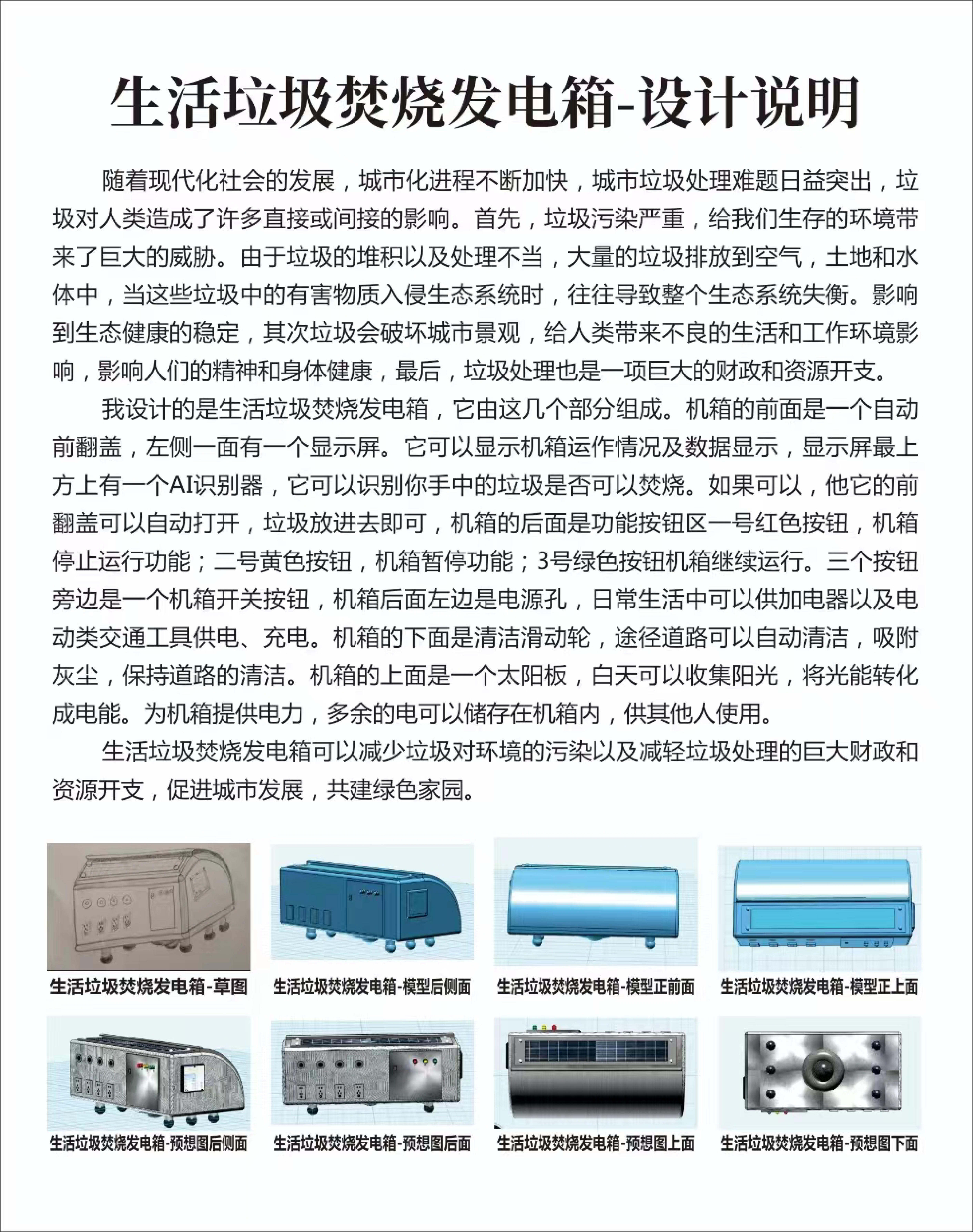 随着现代化社会的发展,城市化进程不断加快,城市垃圾处理难题日益突出,垃圾对人类造成了许多直接或间接的影响。首先,垃圾污染严重,给我们生存的环境带来了巨大的威胁。由此我得到启发,设计出生活垃圾焚烧发电箱,可以减少垃圾对环境的污染以及减轻垃圾处理的巨大财政和资源开支,促进城市发展,共建绿色家园。