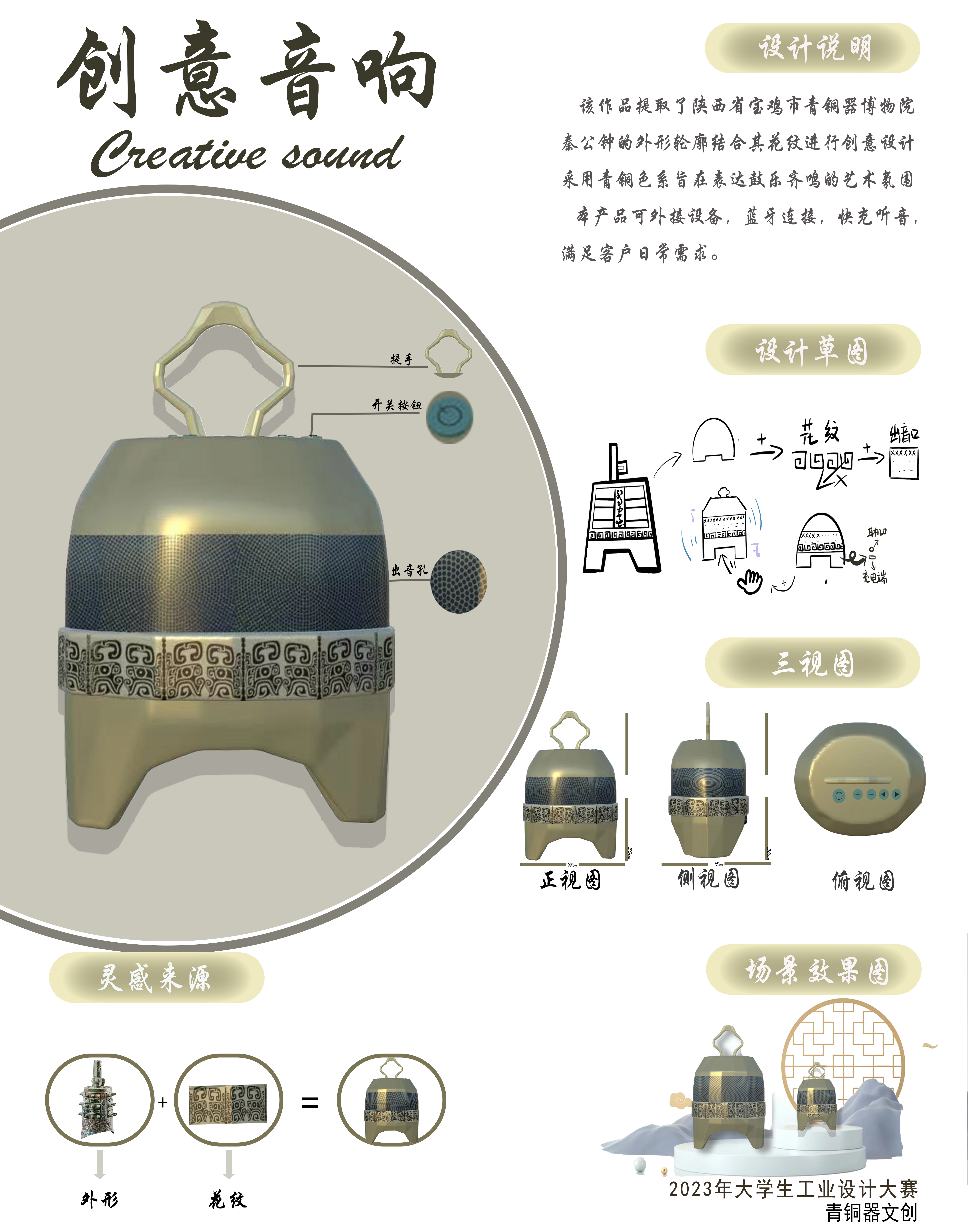 该作品提取了陕西省宝鸡市青铜器博物院中,秦公钟的外形轮廓结合并其花纹进行创意设计,主色调采用青铜色系,旨在给用户提供鼓乐齐鸣的听音感受。 本产品还可外接设备,蓝牙连接,充听音,满足大众日常需求。此款文创艺术设计产品将古典音乐造型与现代器具相结合,外观采用金属材质时尚简约大气。