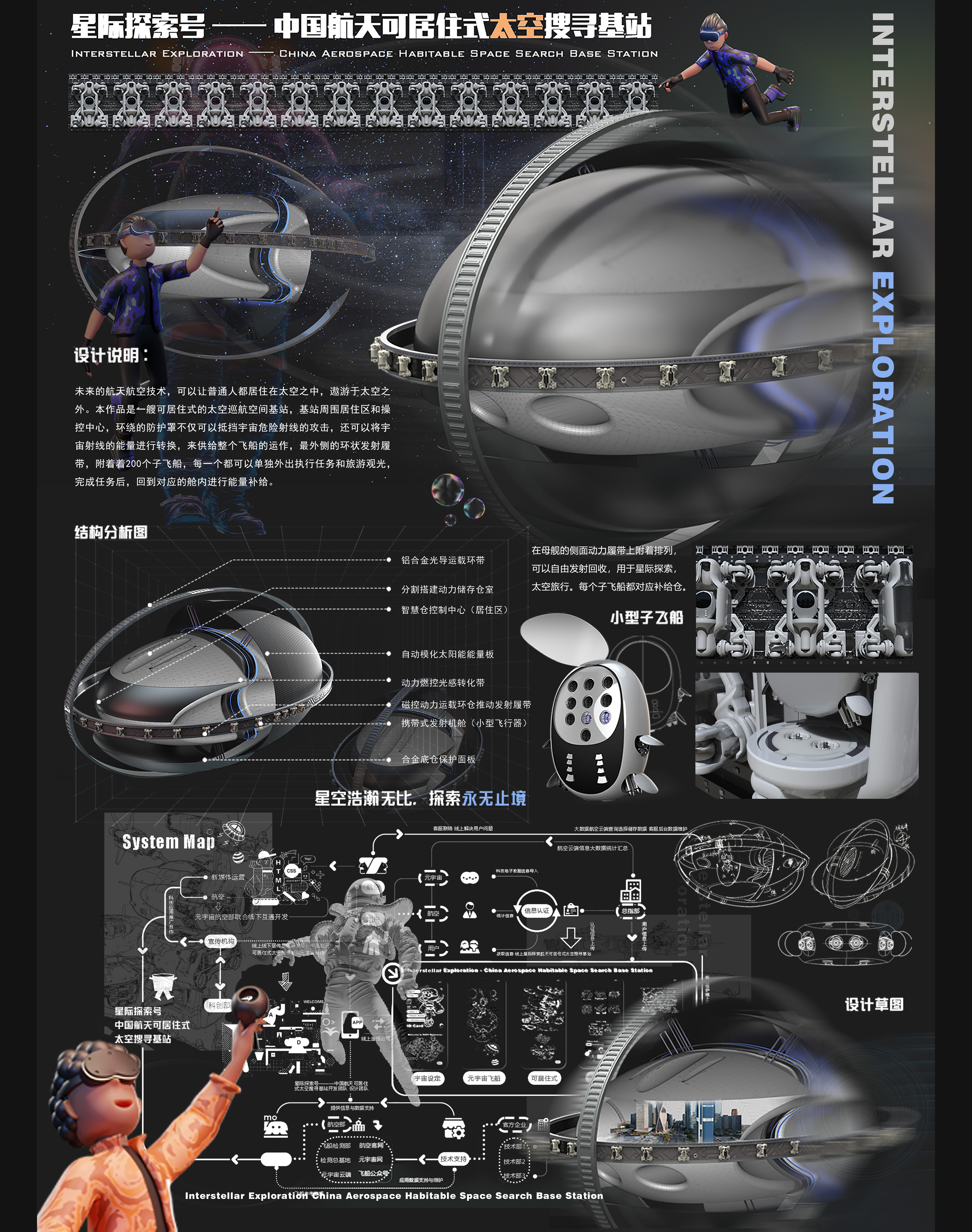 未来的航天航空技术,可以让普通人都居住在太空之中,遨游于太空之外。本作品是一艘可居住式的太空巡航空间基站,基站周围居住区和操控中心,环绕的防护罩不仅可以抵挡宇宙危险射线的攻击,还可以将宇宙射线的能量进行转换,来供给整个飞船的运作,最外侧的环状发射履带,附着着200个子飞船,每一个都可以单独外出执行任务和旅游观光,完成任务后,回到对应的舱内进行能量补给。