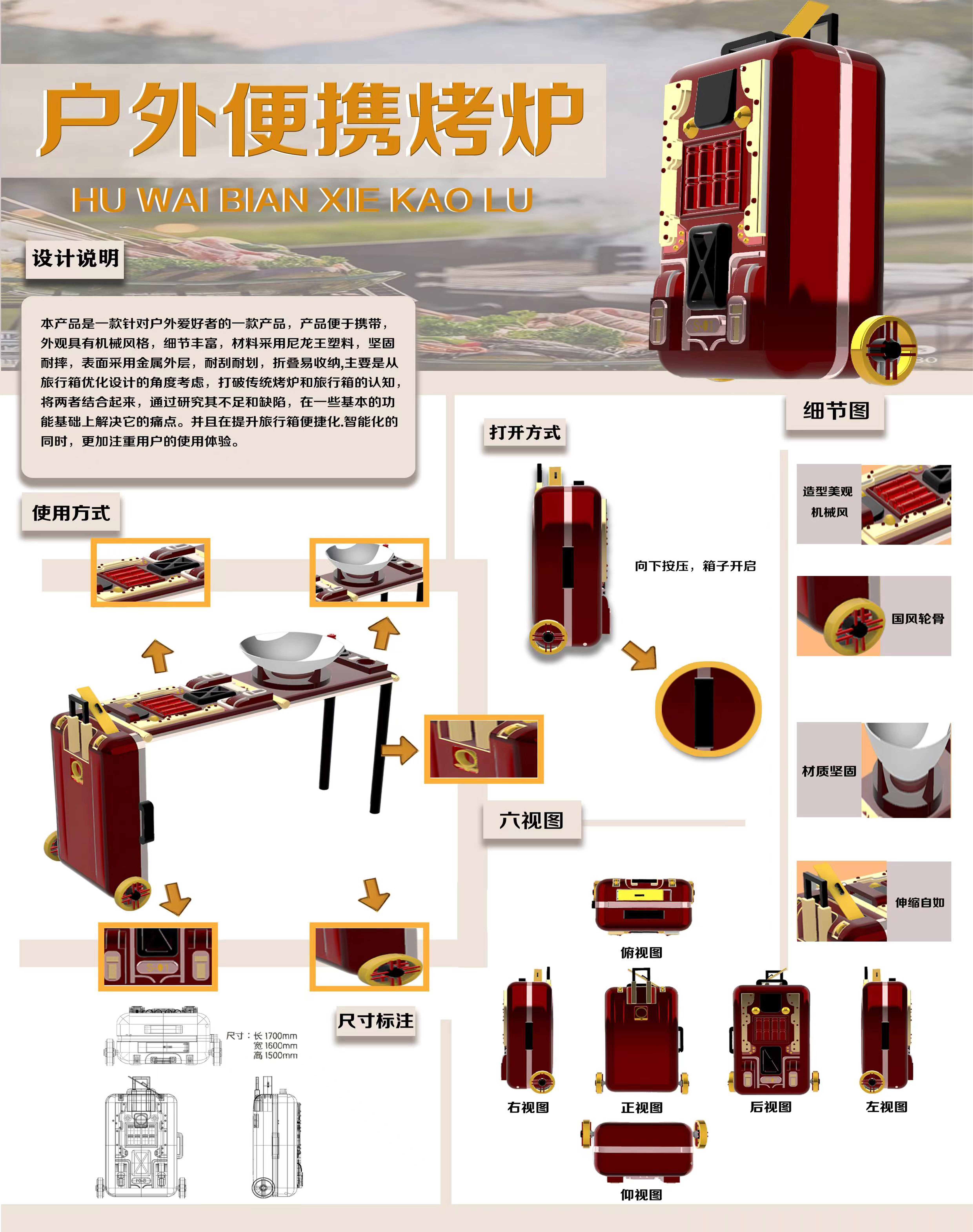 本产品是一款针对户外爱好者的一款产品,产品便于携带,外观具有机械风格,细节丰富,材料采用尼龙王塑料,坚固耐摔,表面采用金属外层,耐刮耐划,折叠易收纳,主要是从旅行箱优化设计的角度考虑,打破传统烤炉和旅行箱的认知,将两者结合起来,通过研究其不足和缺陷,在一些基本的功能基础上解决它的痛点。并且在提升旅行箱便捷化.智能化的同时,更加注重用户的使用体验。