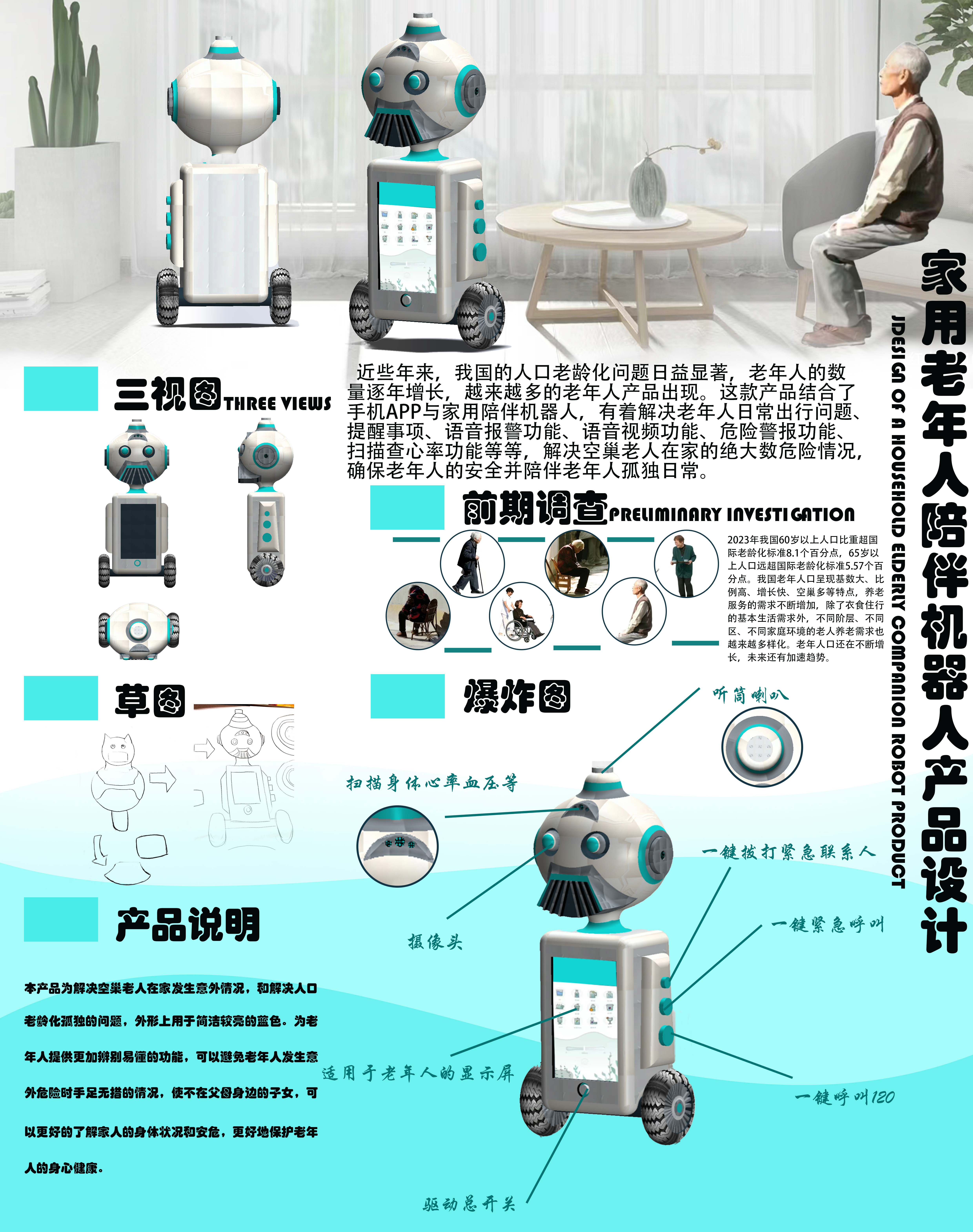 本产品为解决空巢老人在家发生意外情况,和解决人口老龄化孤独的问题,外形上用于简洁较亮的蓝色。为老年人提供更加辨别易懂的功能,可以避免老年人发生意外危险时手足无措的情况,使不在父母身边的子女,可以更好的了解家人的身体状况和安危,更好地保护老年人的身心健康。