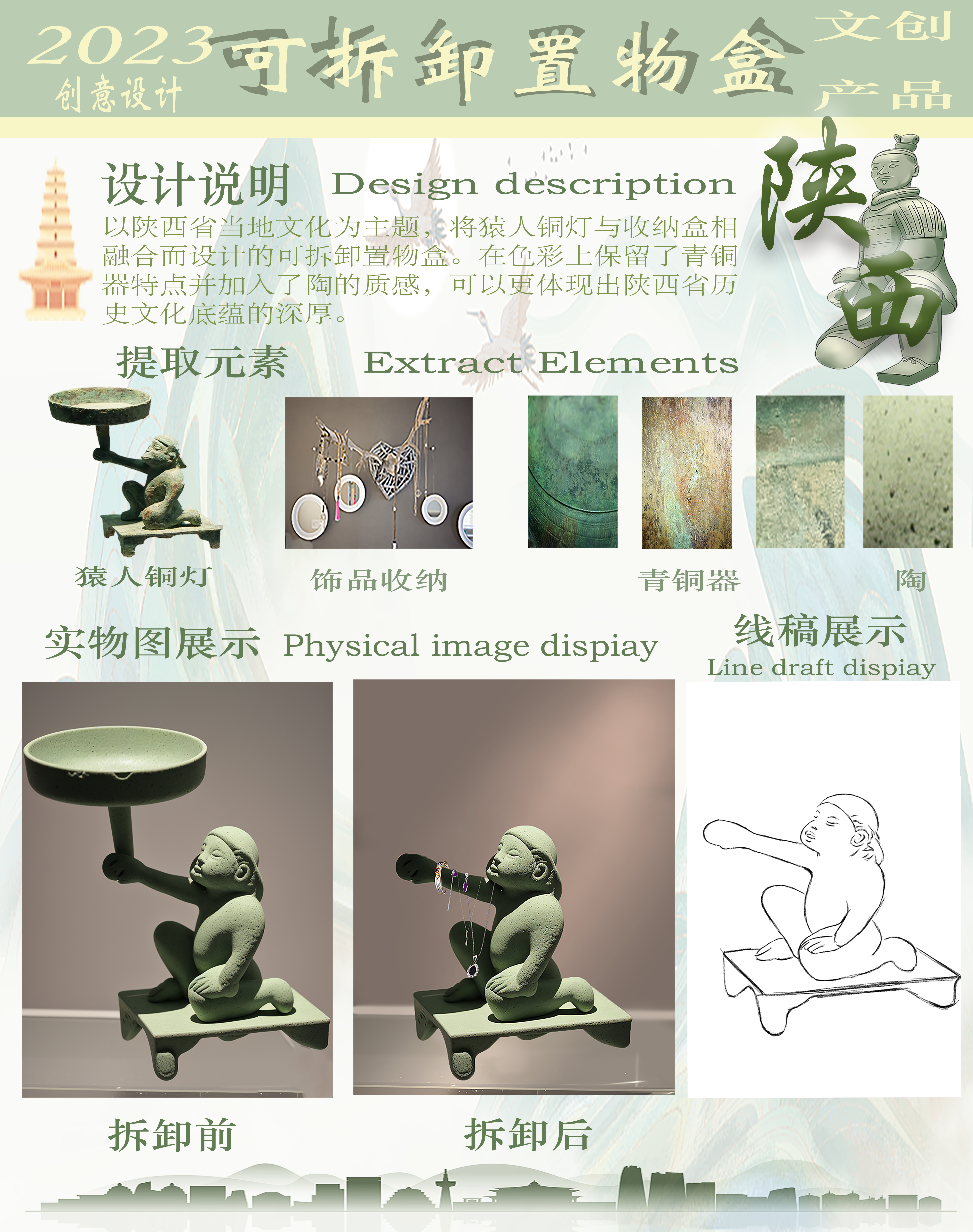 以陕西省当地文化为主题,将猿人铜灯与收纳盒相融合而设计的可拆卸置物盒。在色彩上保留了青铜器特点并加入了陶的质感,可以更体现出陕西省历史文化底蕴的深厚。