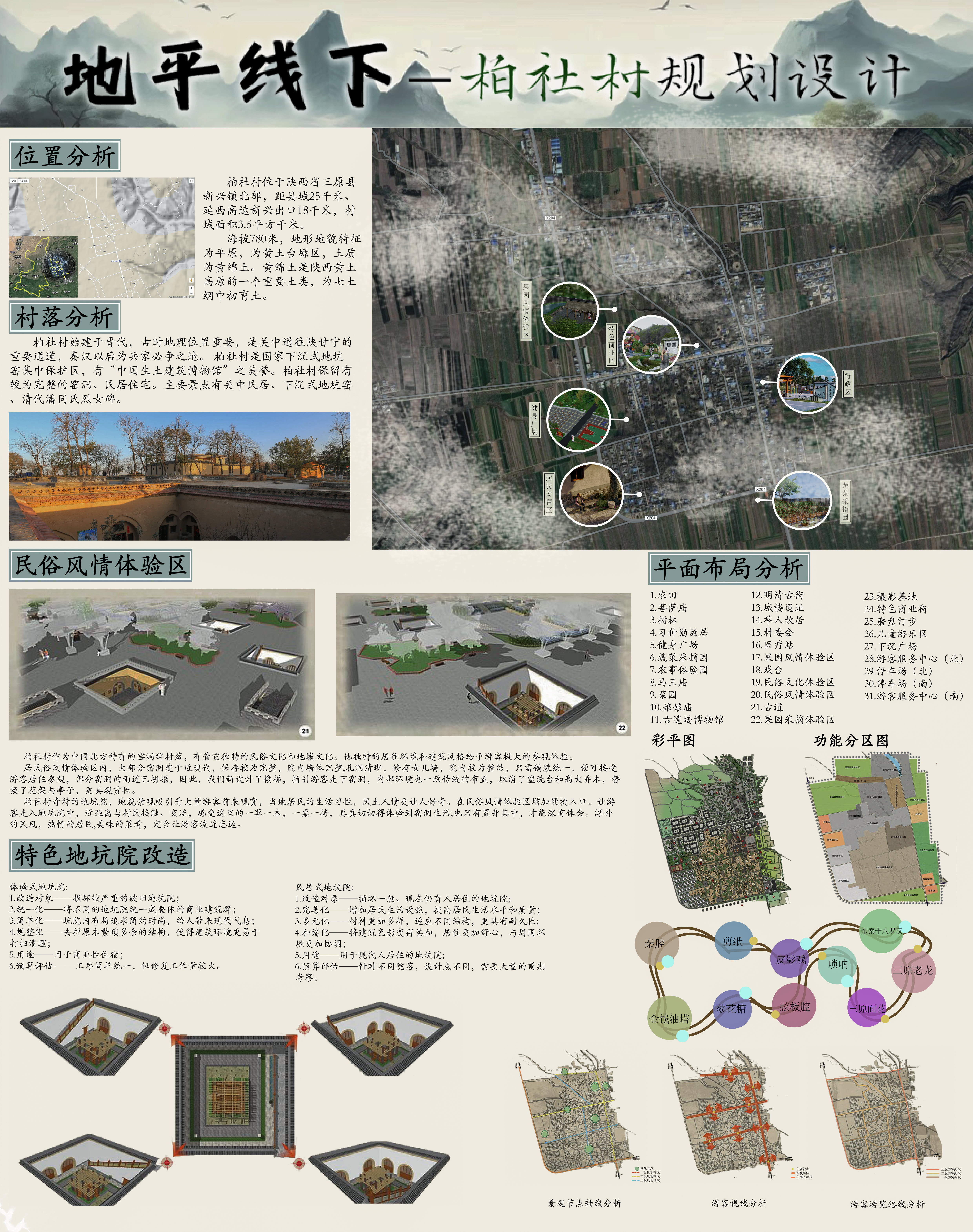 城乡统筹发展趋势下,风貌改造是近年来乡村振兴的重中之重。本方案位于关中地区的一个村庄,是国家下沉式地坑窑集中保护区,有“中国生土建筑博物馆”之美誉。但村内大多数地上建筑损毁严重,村内地坑院多数以无人居住,无人管理。本方案改造了居民生活环境,使得居民生活质量提高,村庄环境优化,规划旅游项目,促进村庄经济发展。