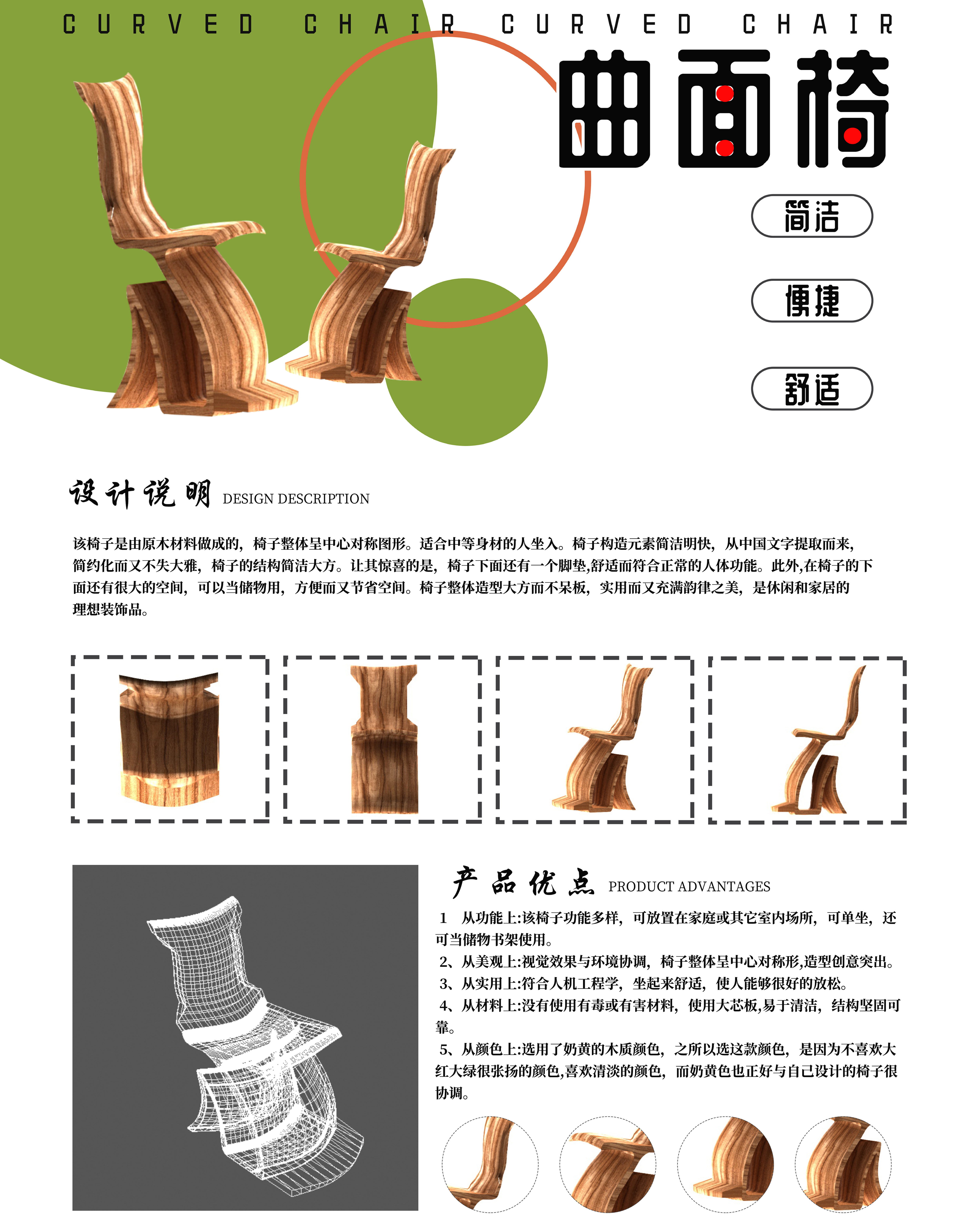 该椅子是由原木材料做成的,椅子整体呈中心对称图形。适合中等身材的人坐入。椅子构造元素简洁明快,从中国文字提取而来,简约化而又不失大雅,椅子的结构简洁大方。让其惊喜的是,椅子下面还有一个脚垫,舒适而符合正常的人体功能。此外,在椅子的下面还有很大的空间,可以当储物用,方便而又节省空间。椅子整体造型大方而不呆板,实用而又充满韵律之美,是休闲和家居的理想装饰品。