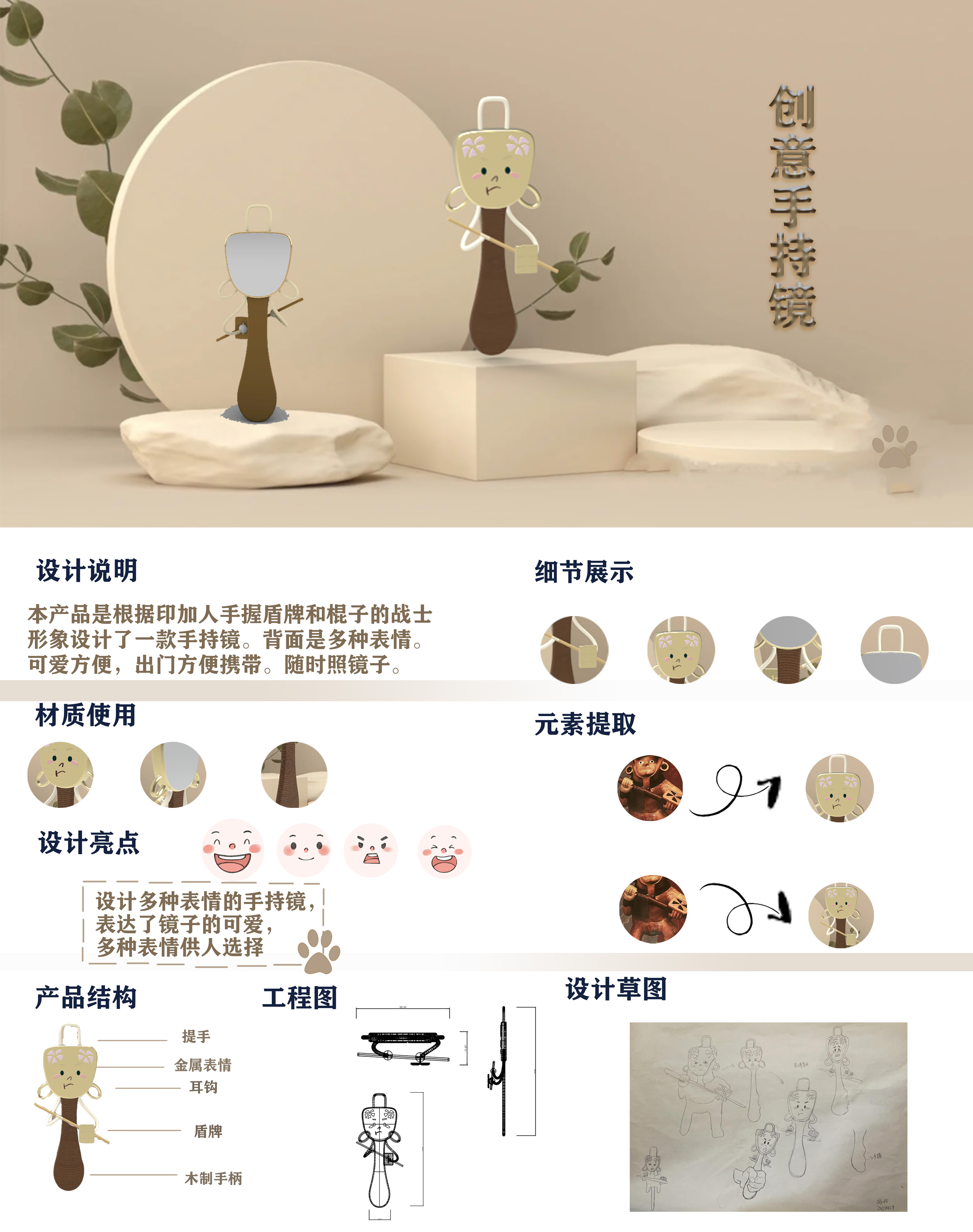 本产品是根据陕西历史博物馆印加人手握盾牌和棍子的战士形象设计了一系列手持镜。背面是多种表情,丰富精彩,可爱方便,出门方便携带,随时照镜子。在总体布局方面满足用户的需求,以小巧可爱的装饰,吸引用户,将印加人手握盾牌和战士的形象可爱化。