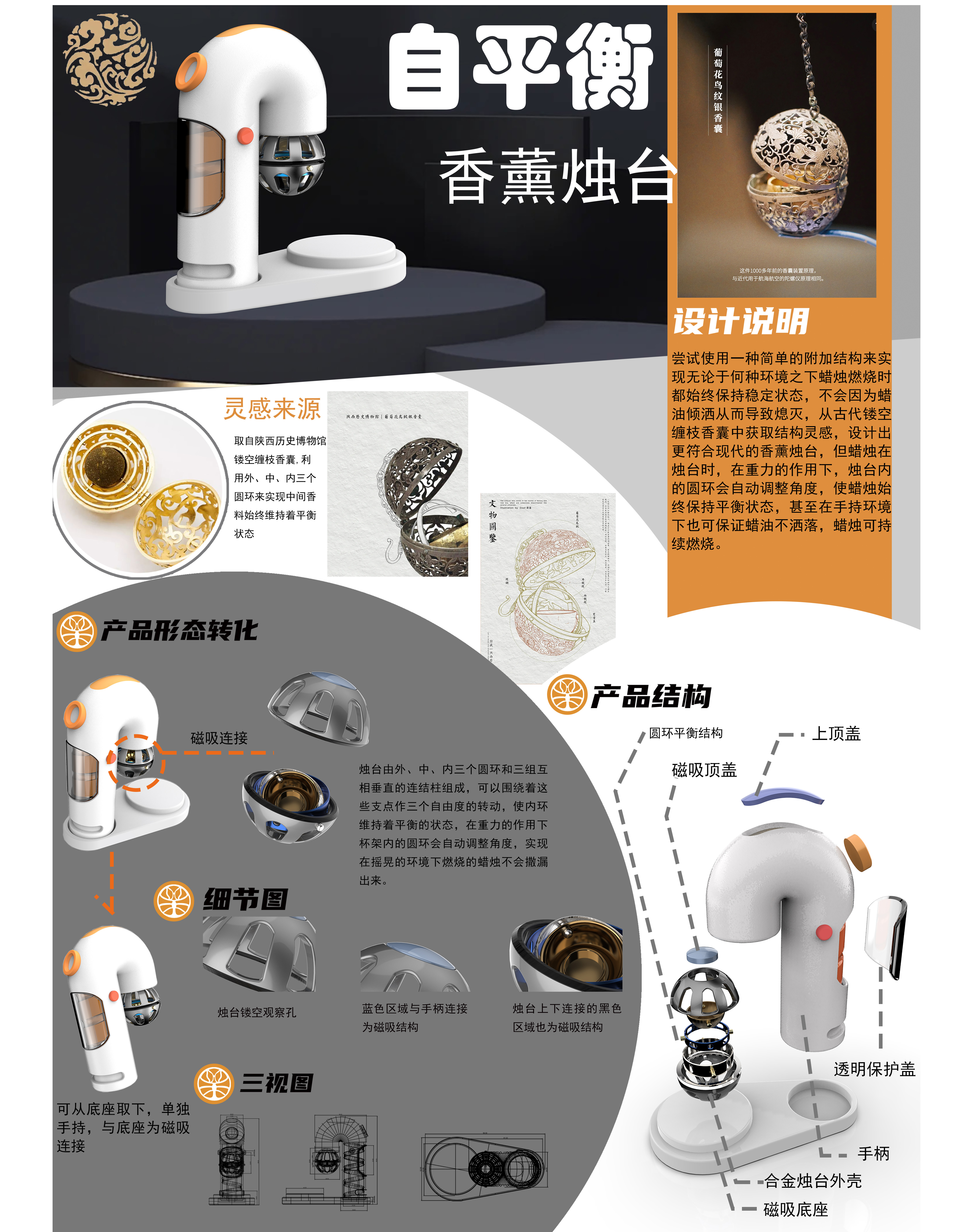 取自陕西历史博物馆的唐代葡萄花鸟纹银香囊,利用其中的陀螺仪原理与现代审美相互结合设计出的香薰烛台,使香薰蜡烛不再是只能在家中某个房间内固定摆放,而是可以随声带走在任何一个房间使用,不用担心在移动过程中蜡油溢出的问题