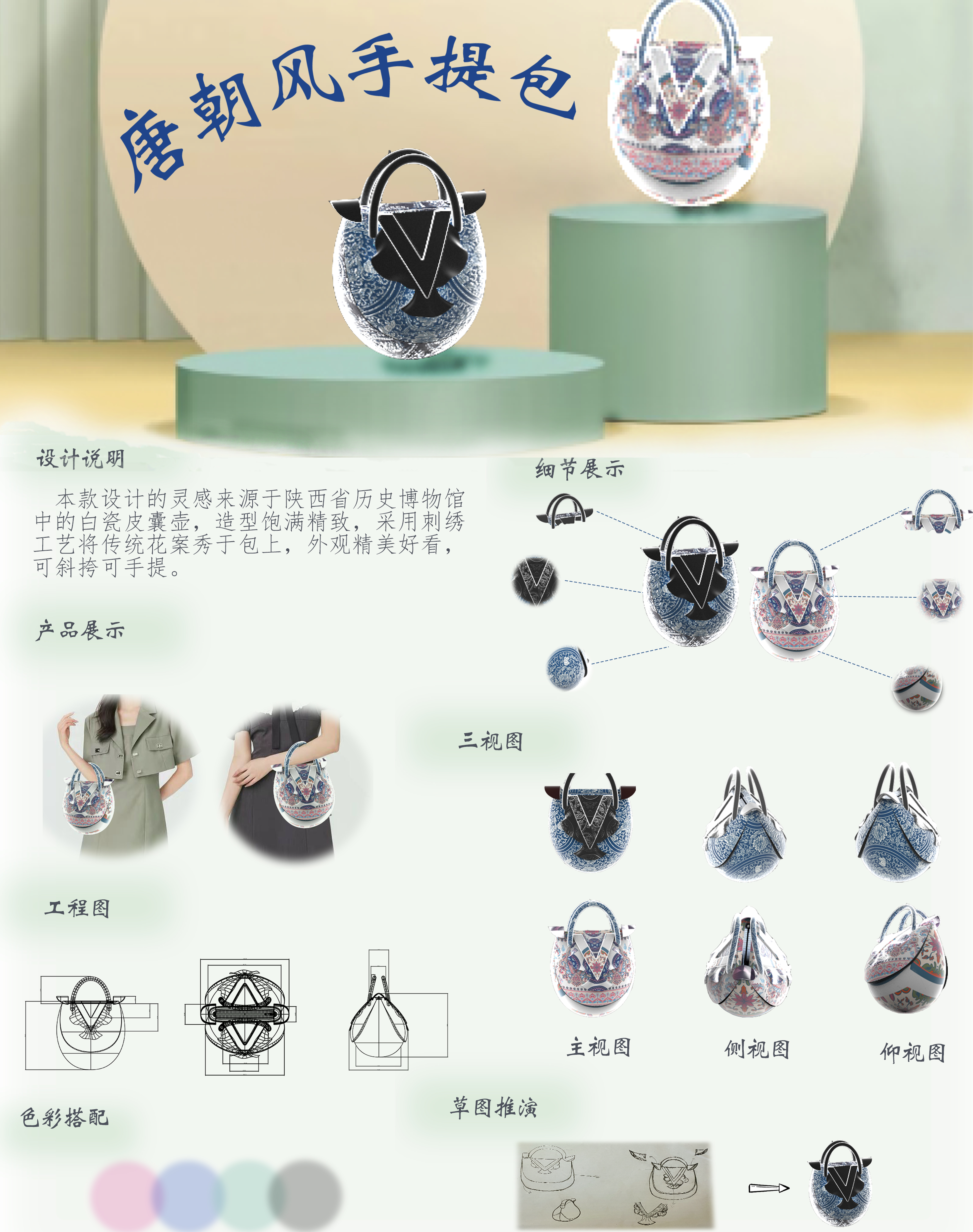 本款设计的灵感来源于陕西省历史博物馆中出土的唐代白瓷皮囊壶,它充满异域风情,是唐代胡风盛行时期的产物。造型饱满精致,这款唐朝风手提包设计采用刺绣工艺将传统花案秀于包上,外观复古精美好看可手提,可斜挎。