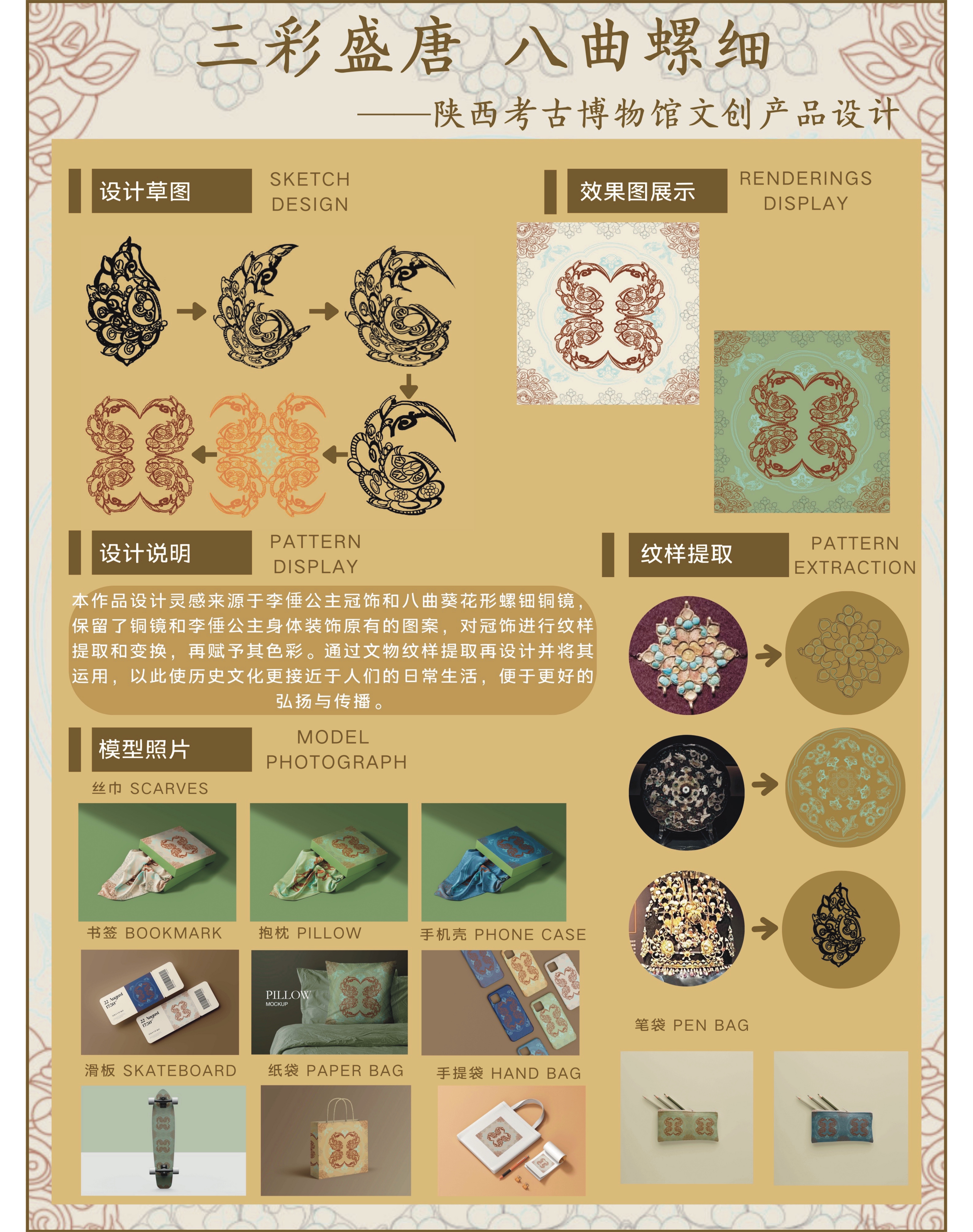 本作品设计灵感来源于李倕公主冠饰和八曲葵花形螺钿铜镜,保留了铜镜和李倕公主身体装饰原有的图案,对冠饰进行纹样提取和变换,再赋予其色彩。通过文物纹样提取再设计并将其运用,以此使历史文化更接近于人们的日常生活,便于更好的弘扬与传播。