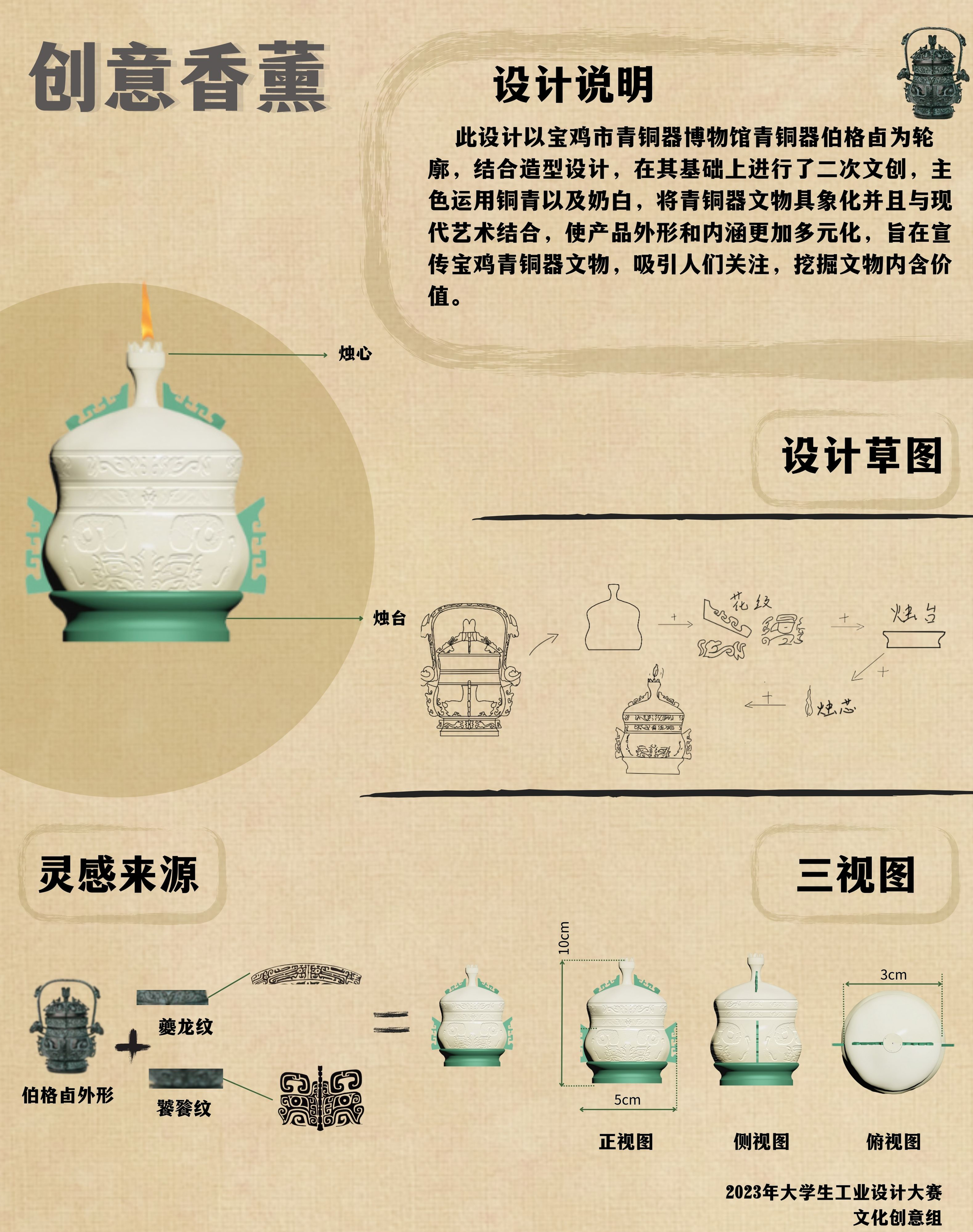 此设计以宝鸡市青铜器博物馆青铜器伯格卣为轮廓,结合造型设计,在其基础上进行了二次文创,主色运用铜青以及奶白,将青铜器文物具象化并且与现代艺术结合,使产品外形和内涵更加多元化,旨在宣传宝鸡青铜器文物,吸引人们关注,挖掘文物内含价值。