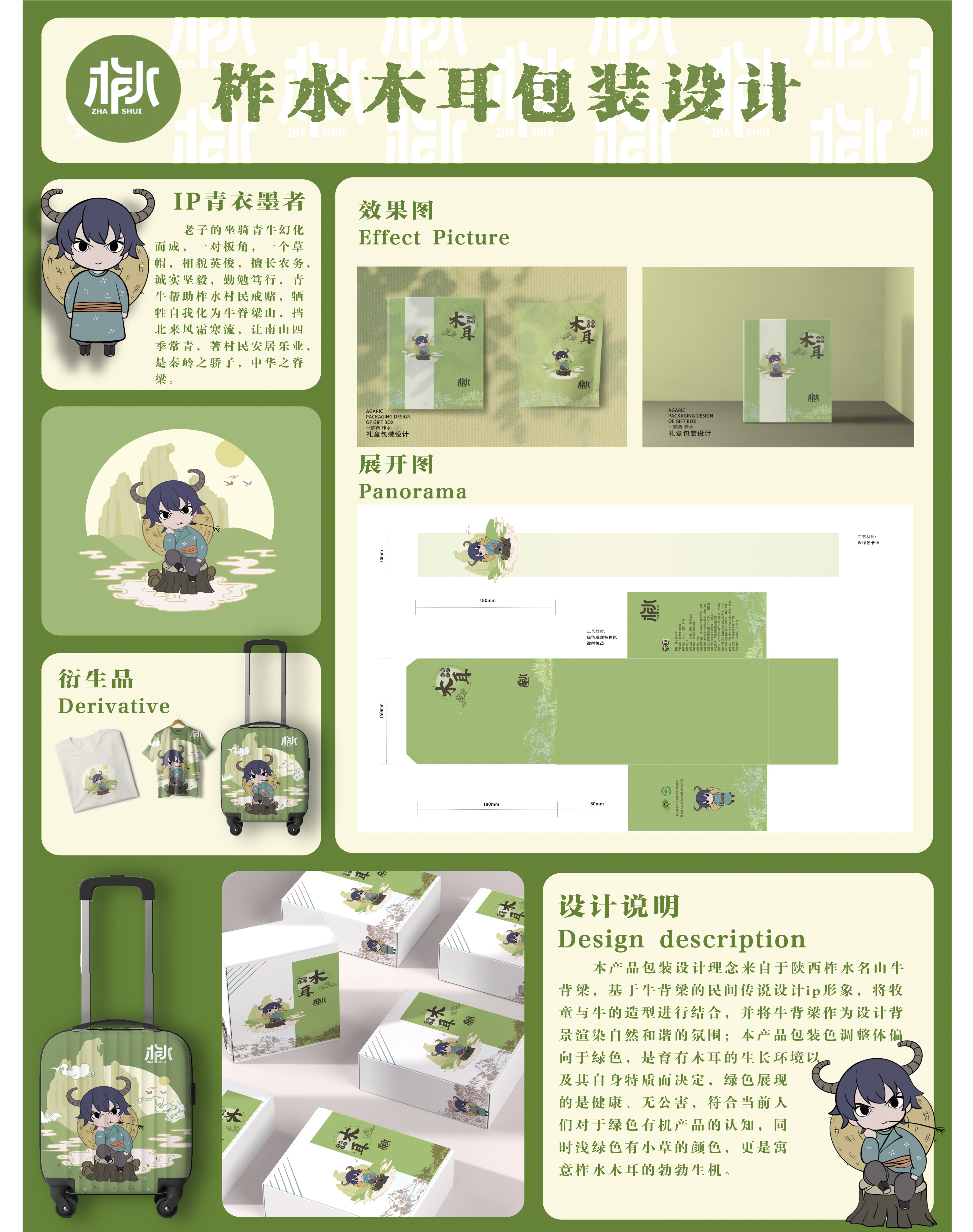通过做柞水县农产品木耳的包装设计,起到提高农产品的销售量来推动农村经济发展。该设计形象来源于陕西柞水名山牛背梁,将牧童与牛的造型进行结合,将该形象作为背景,本产品包装色调整体偏向绿色,是育有木耳的生长环境以及其自身特质而决定,绿色展现的是健康,无公害,符合当前人们对于绿色有机产品的认知,同时浅绿色有小草的颜色,更是寓意柞水木耳的勃勃生机。