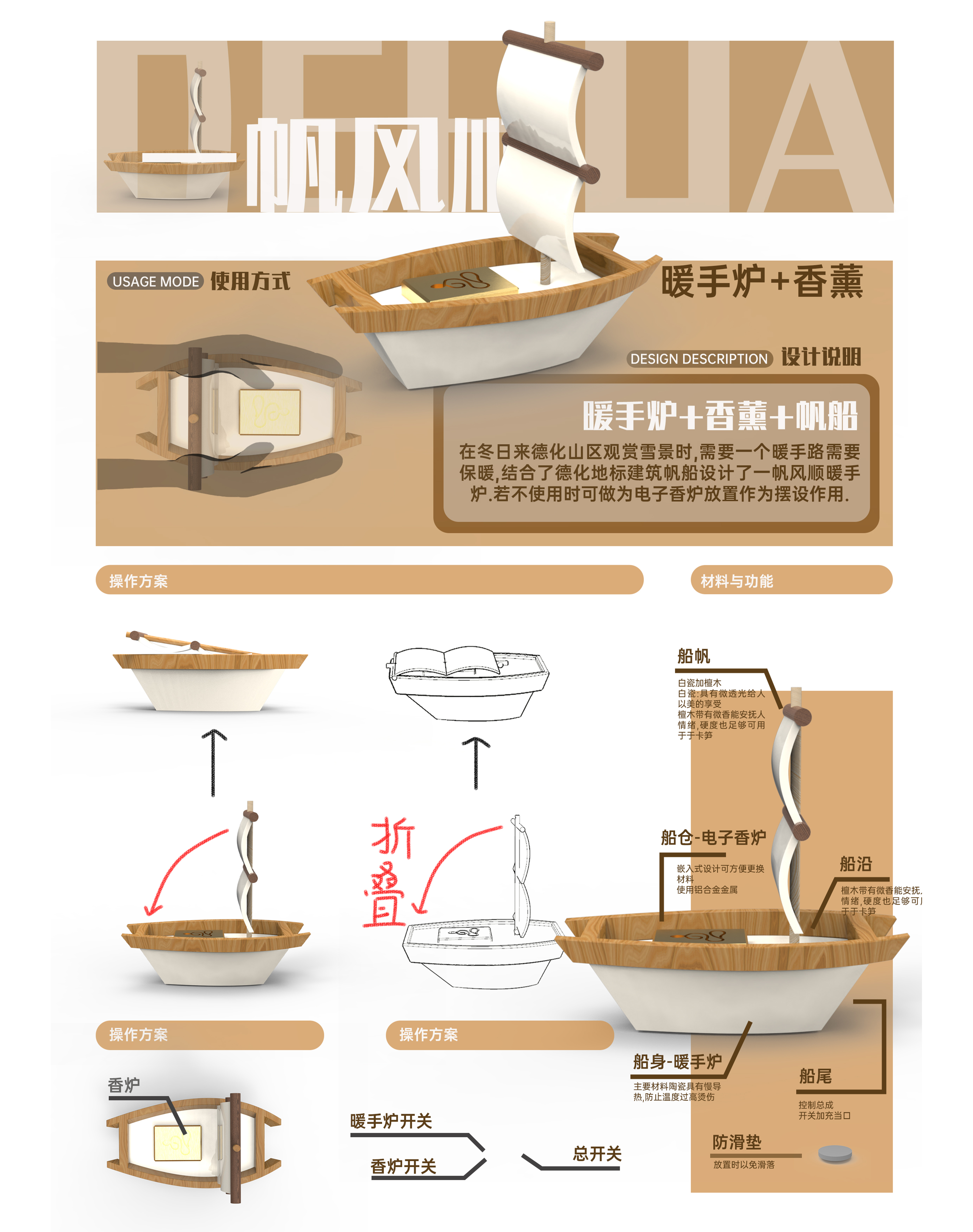 暖手炉+香薰+帆船 在冬日来德化山区观赏雪景时,需要一个暖手路需要保暖,结合了德化地标建筑帆船设计了一帆风顺暖手炉.若不使用时可做为电子香炉放置作为摆设作用