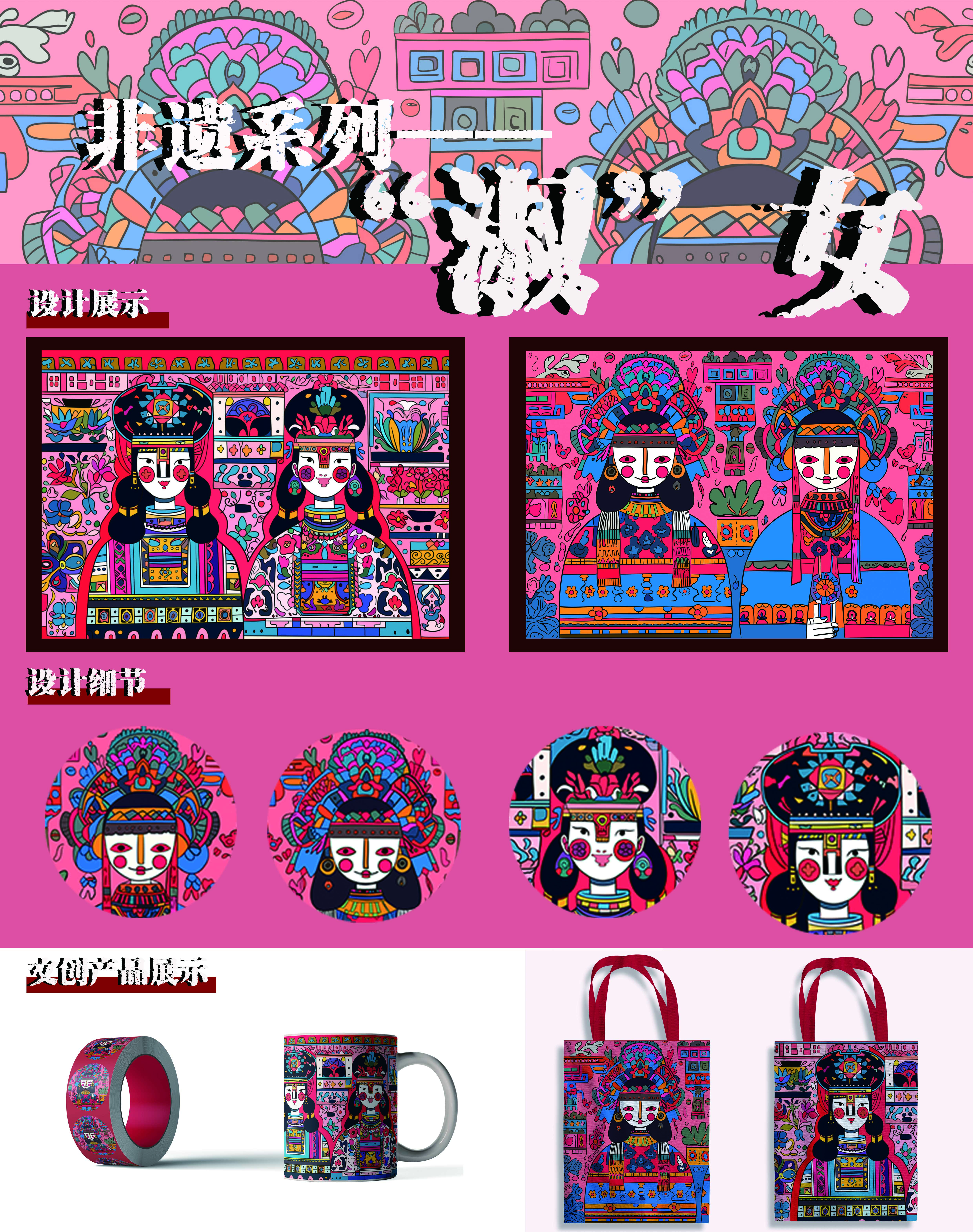 这一系列作品为两幅,旨在将陕北库淑兰老师的剪纸作品融会贯通,使用了年轻人能够被接受的颜色,形式,创造出了四个女性人物形象,使得这份艺术发挥它自己独有的作用,使得传统的民俗的东西经久流传。