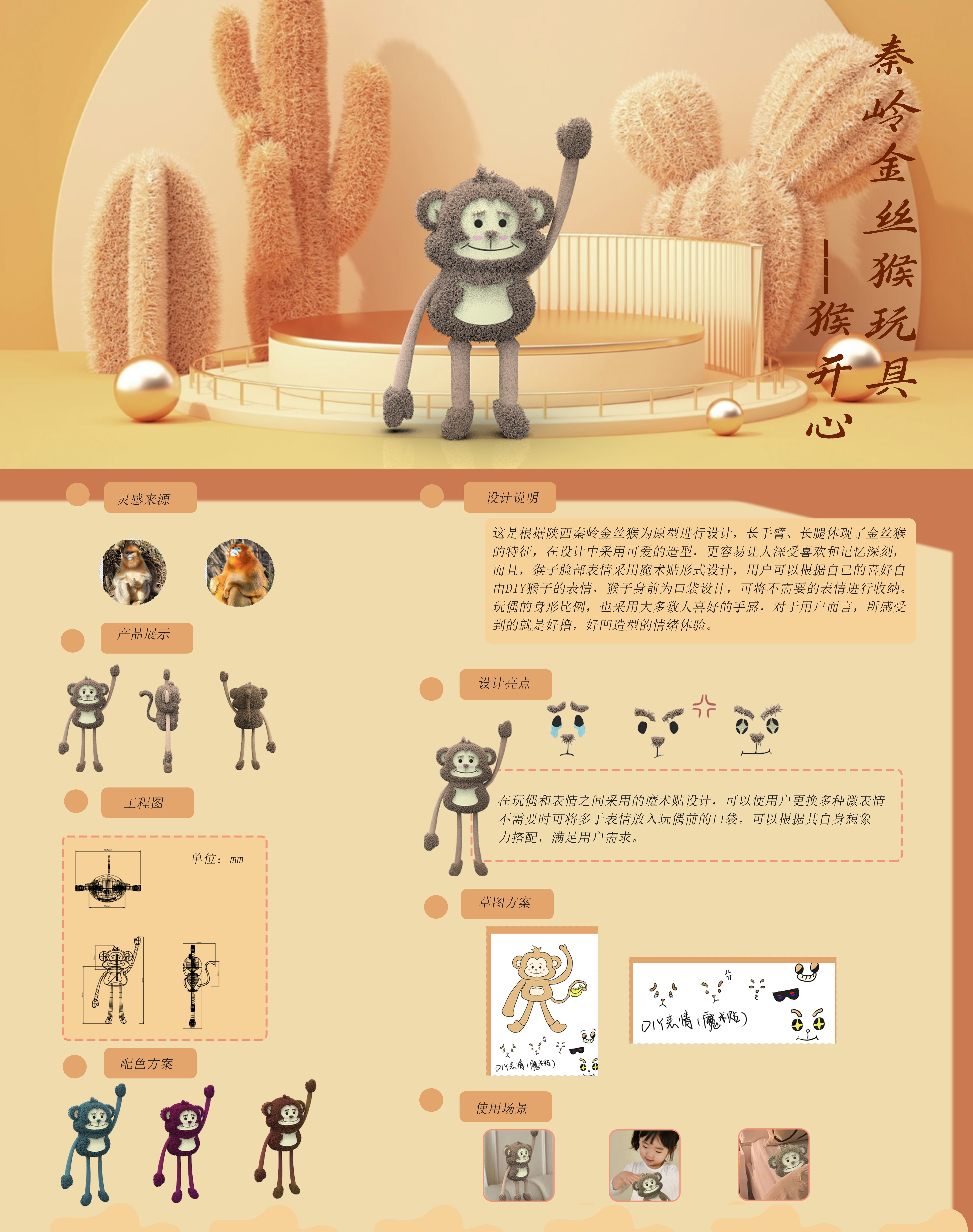 这是根据陕西秦岭金丝猴为原型进行设计,长手臂、长腿体现了金丝猴的特征,在设计中采用可爱的造型,更容易让人深受喜欢和记忆深刻,而且,金丝猴脸部表情采用魔术贴形式设计,用户可以根据自己的喜好自由DTY金丝猴的表情,金丝猴身前为口袋设计,可将不需要的表情进行收纳。玩偶的身形比例,也采用大至数人喜好的手感,对于用户市言,所感受到的就是好撸,好凹造型的情绪体验。