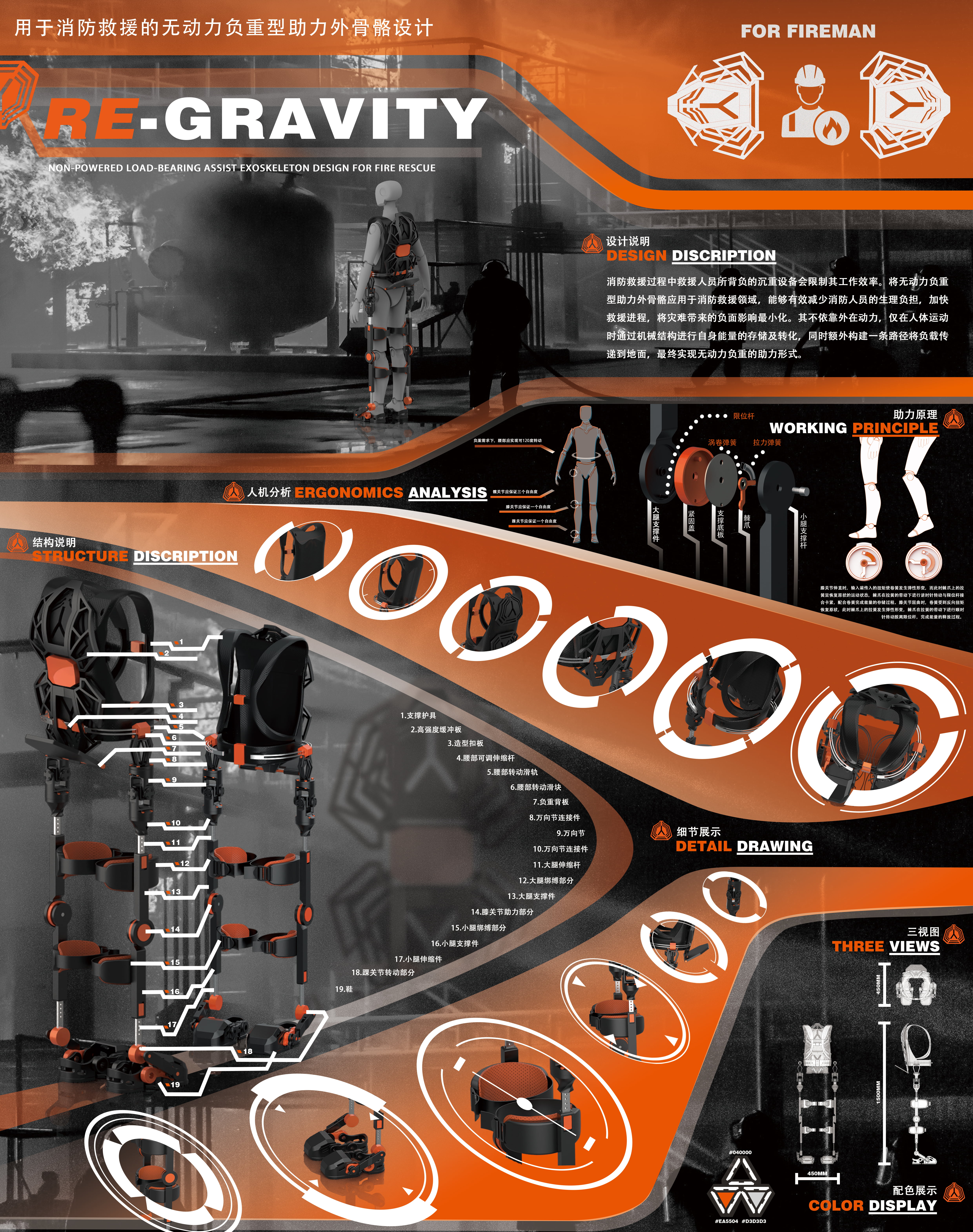 消防救援过程中救援人员所背负的沉重设备会限制其工作效率。将无动力负重型助力外骨骼应用于消防救援领域,能够有效减少消防人员的生理负担,加快救援进程,将灾难带来的负面影响最小化。其不依靠外在动力,仅在人体运动时通过机械结构进行自身能量的存储及转化,同时额外构建一条路径将负载传递到地面,最终实现无动力负重的助力形式。