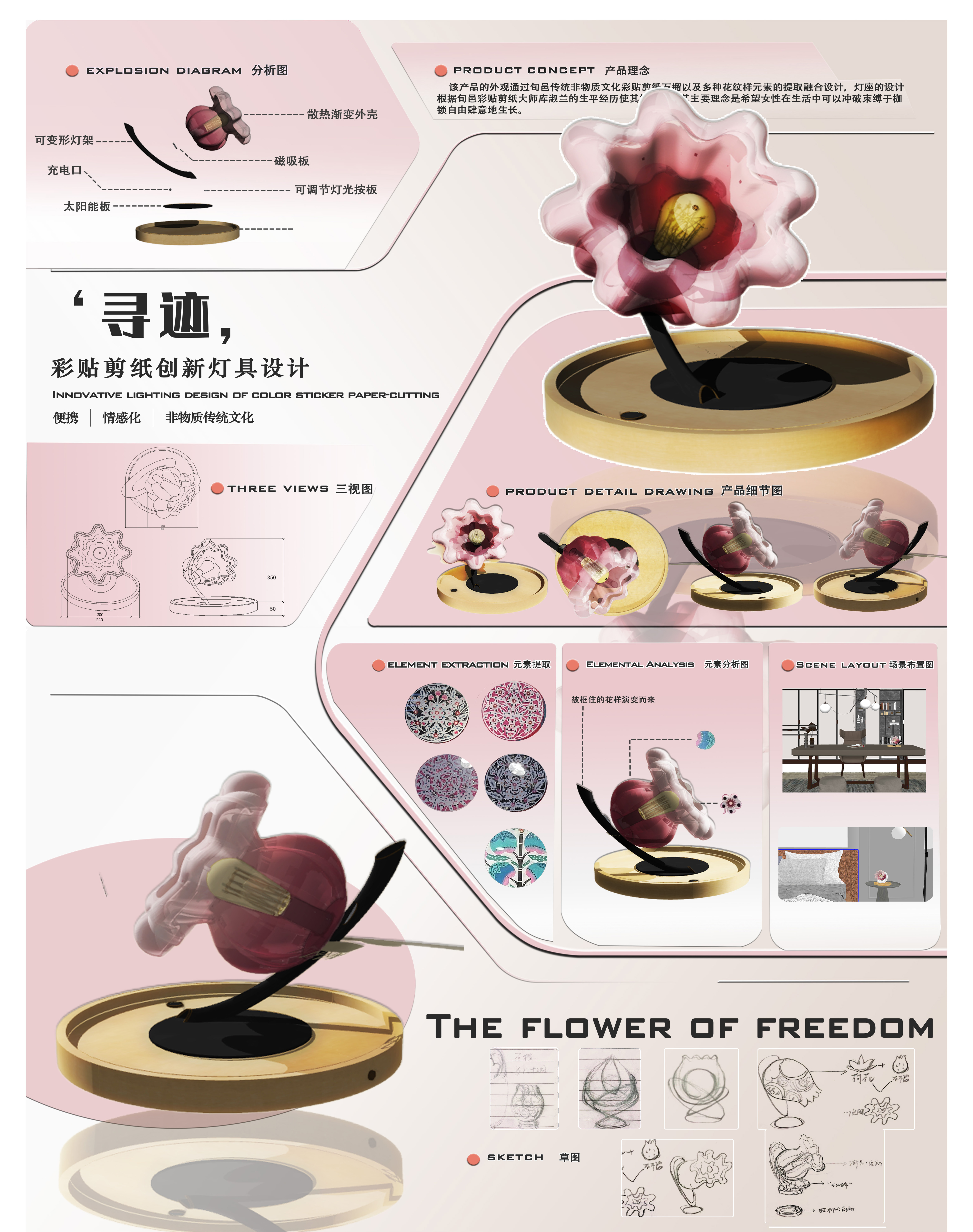 本次大赛我设计的作品是以旬邑非物质文化遗产彩贴剪纸为例的非遗创意台灯设计,该设计采用了对于旬邑彩贴剪纸大师库淑兰老师的作品元素的提取。首先;灯具外观的造型源自于剪花娘子里的石榴以及莲花一元素。其次灯座除了带有充电、可调节光源、太阳能发电功能外,还加入了磁吸功能便于拆卸安装到舒适位置,灯杆可自由调控。最后;灯杆的造型通过剪纸内容的传递,突出希望女性可以冲突封建枷锁与束缚,绽放自由与魅力。