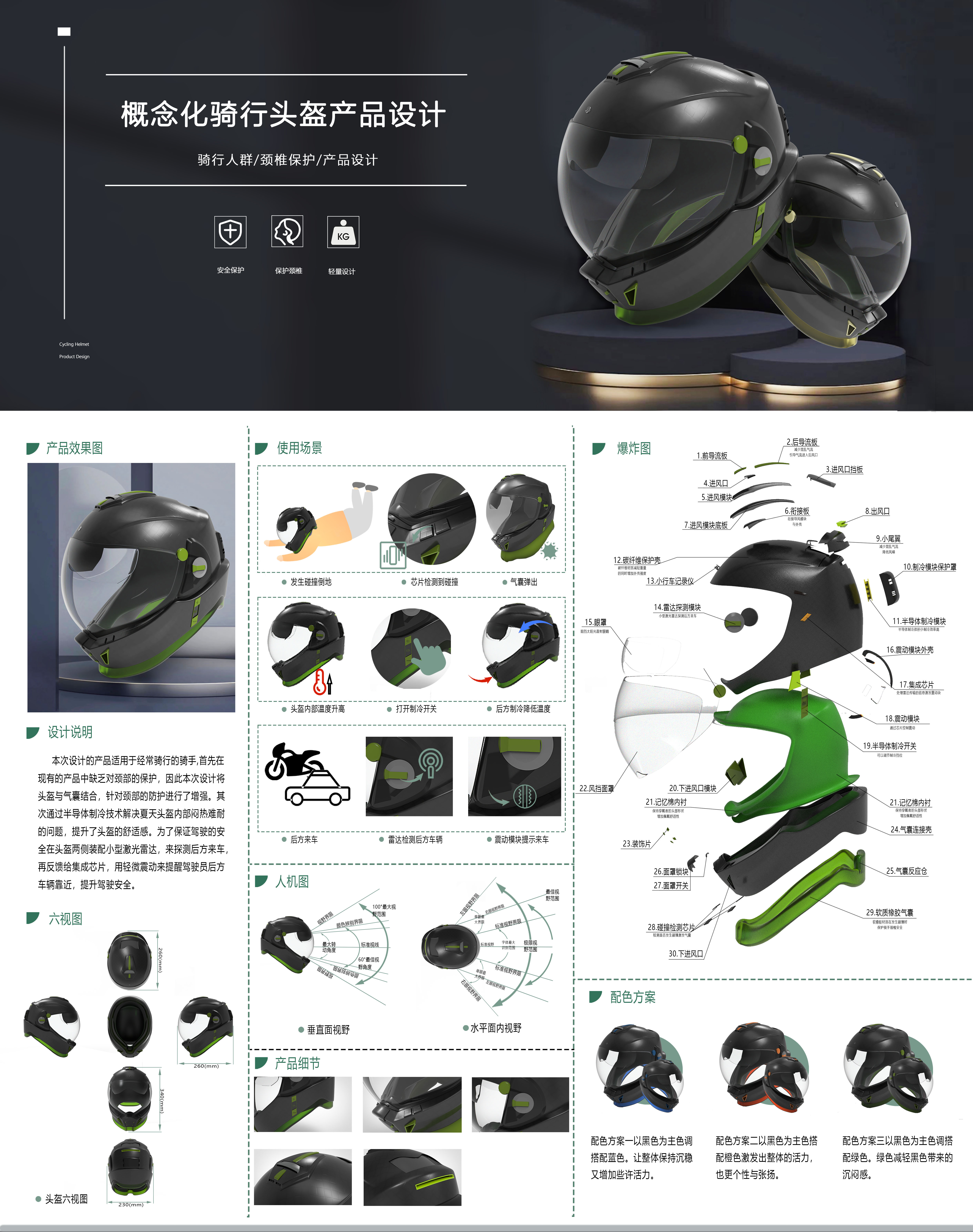 本次设计的产品适用于经常骑行的骑手,首先在现有的产品中缺乏对颈部的保护,因此本次设计将头盔与气囊结合,针对颈部的防护进行了增强。其次通过半导体制冷技术解决夏天头盔内部闷热难耐的问题,提升了头盔的舒适感。为了保证驾驶的安全在头盔两侧装配小型激光雷达,来探测后方来车,再反馈给集成芯片,用轻微震动来提醒驾驶员后方车辆靠近,提升驾驶安全。