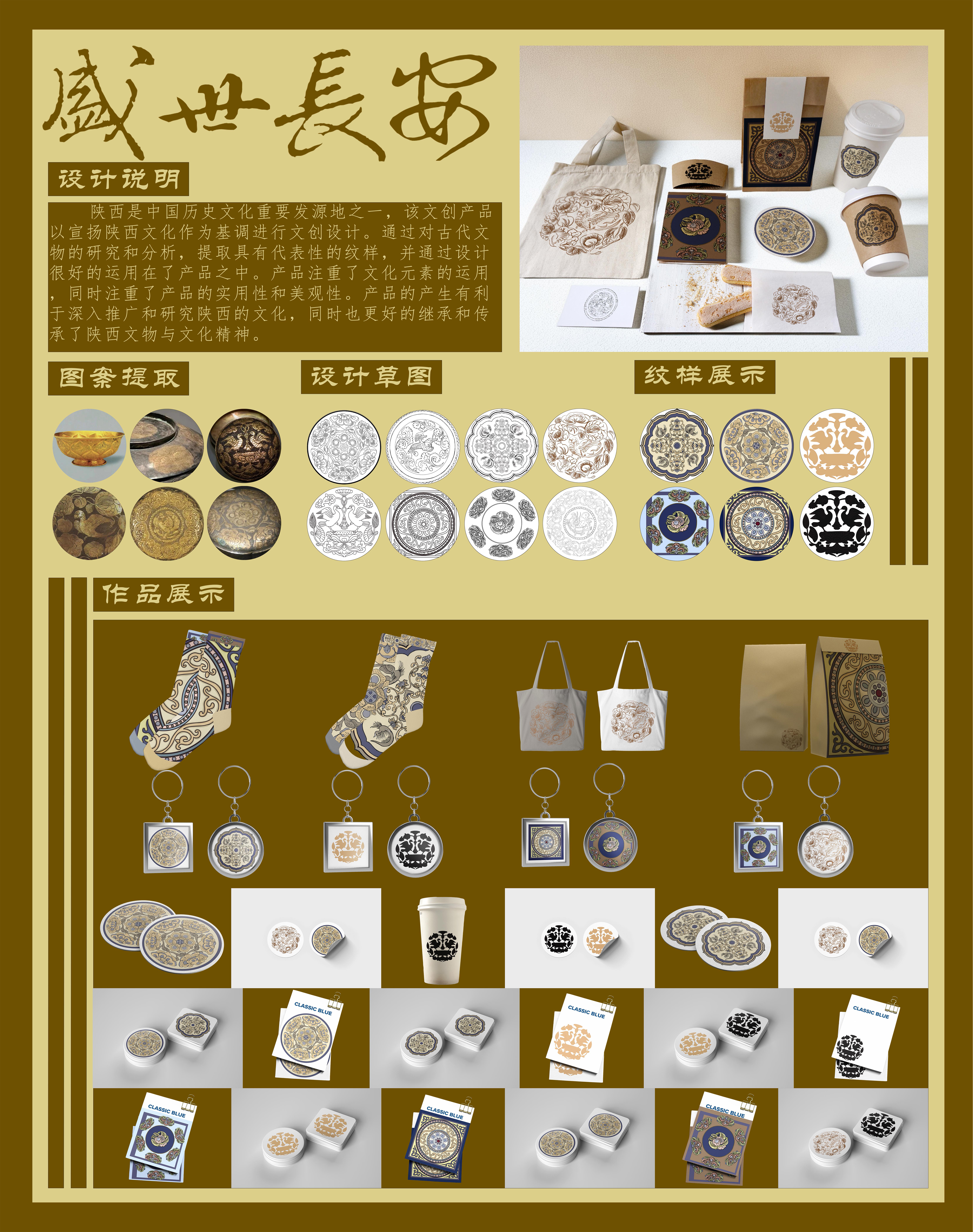 陕西是中国历史文化重要发源地之一,该文创产品以宣扬陕西文化作为基调进行文创设计。通过对古代文物的研究和分析,提取具有代表性的纹样,并通过设计很好的运用在了产品之中。产品注重了文化元素的运用同时注重了产品的实用性和美观性。产品的产生有利于深入推广和研究陕西的文化,同时也更好的继承和传承了陕西文物与文化精神。