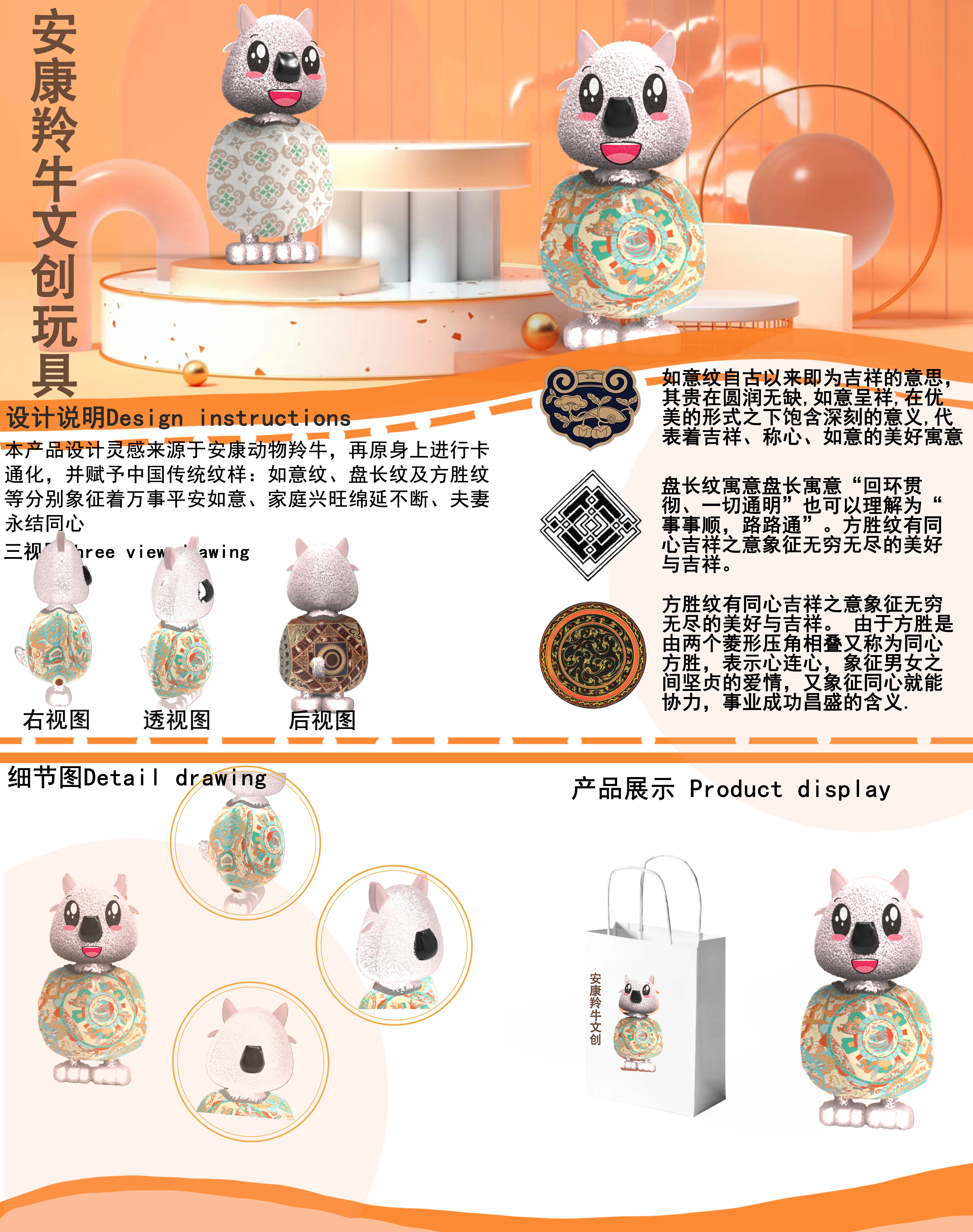 本产品设计灵感来源于安康动物羚牛,再原身上进行卡通化,并赋予中国传统纹样:如意纹、盘长纹及方胜纹等分别象征着万事平安如意、家庭兴旺绵延不断、夫妻 永结同心