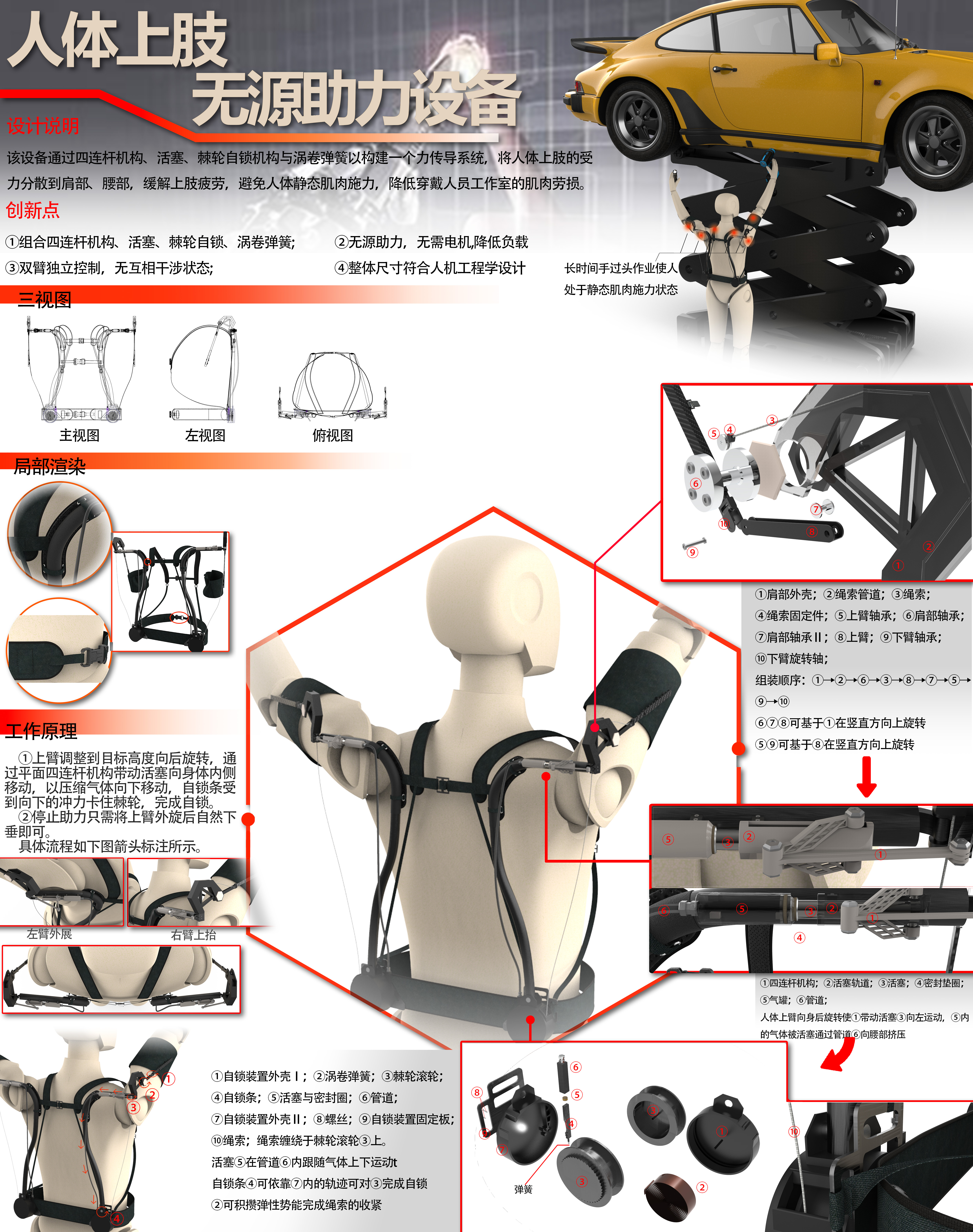 依托于电机及液压等结构的上肢助力设备负载较大,为避免人体长时间抬手作业引发的静态肌肉施力及设备重量对人体造成的不可逆伤害,设计了一款结合四连杆机构、气体、棘轮及涡卷弹簧的无源上肢助力设备。该设备采用碳纤维、铝、尼龙等材料制作,十分轻便,易于穿戴,对人体负载极低。穿戴完成后,上臂调整到目标高度后向后旋转即可实现自锁控制。