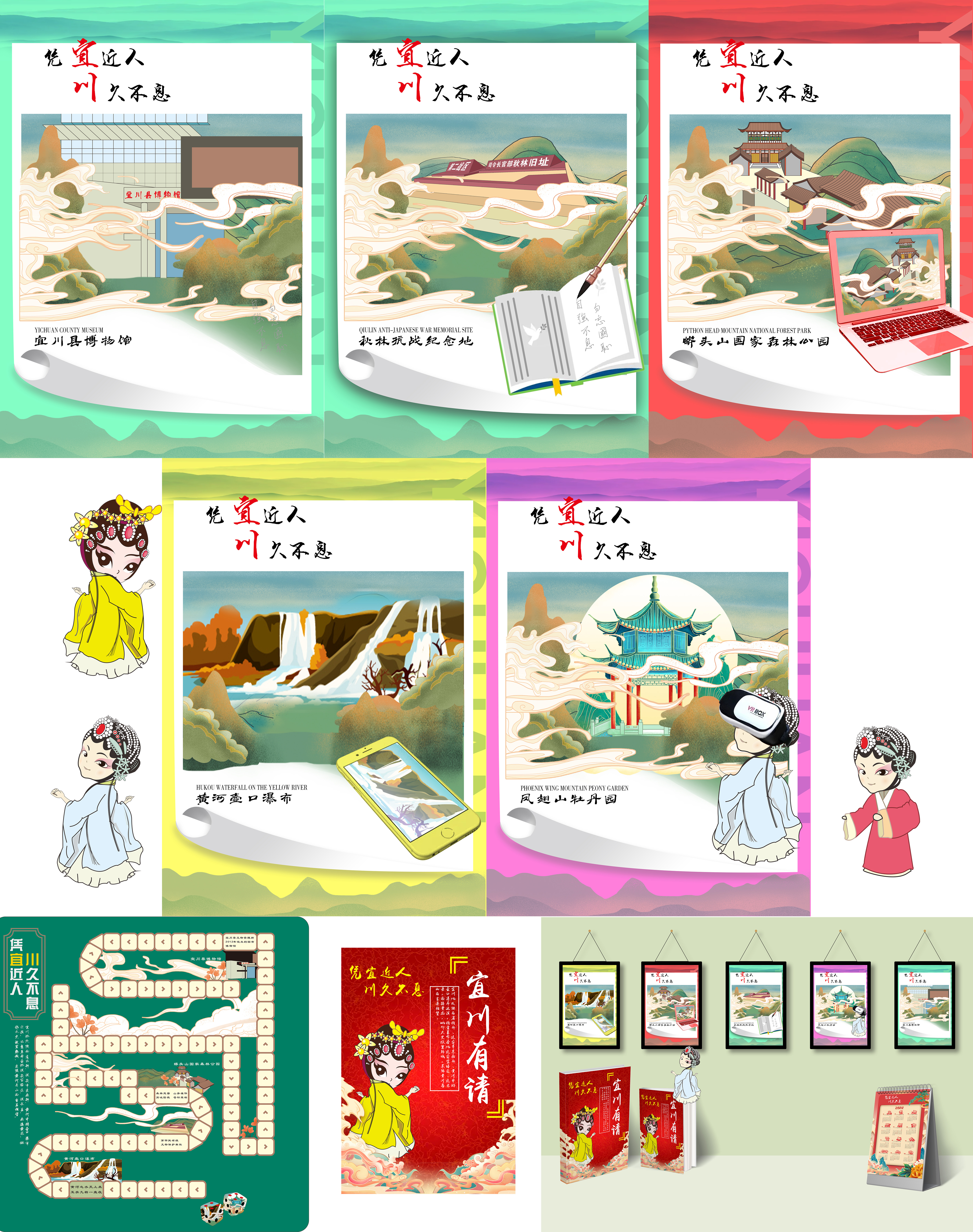 作品结合国潮风格,带有中国特色元素,将国潮与宜川风光结合,黄河壶口瀑布、蟒头山国家森林公园、凤翅山牡丹园、秋林抗战纪念地景区、宜川县博物馆等都将融入今年来流行的国潮风格,并制造出具有别具一番特色的文创包装产品。