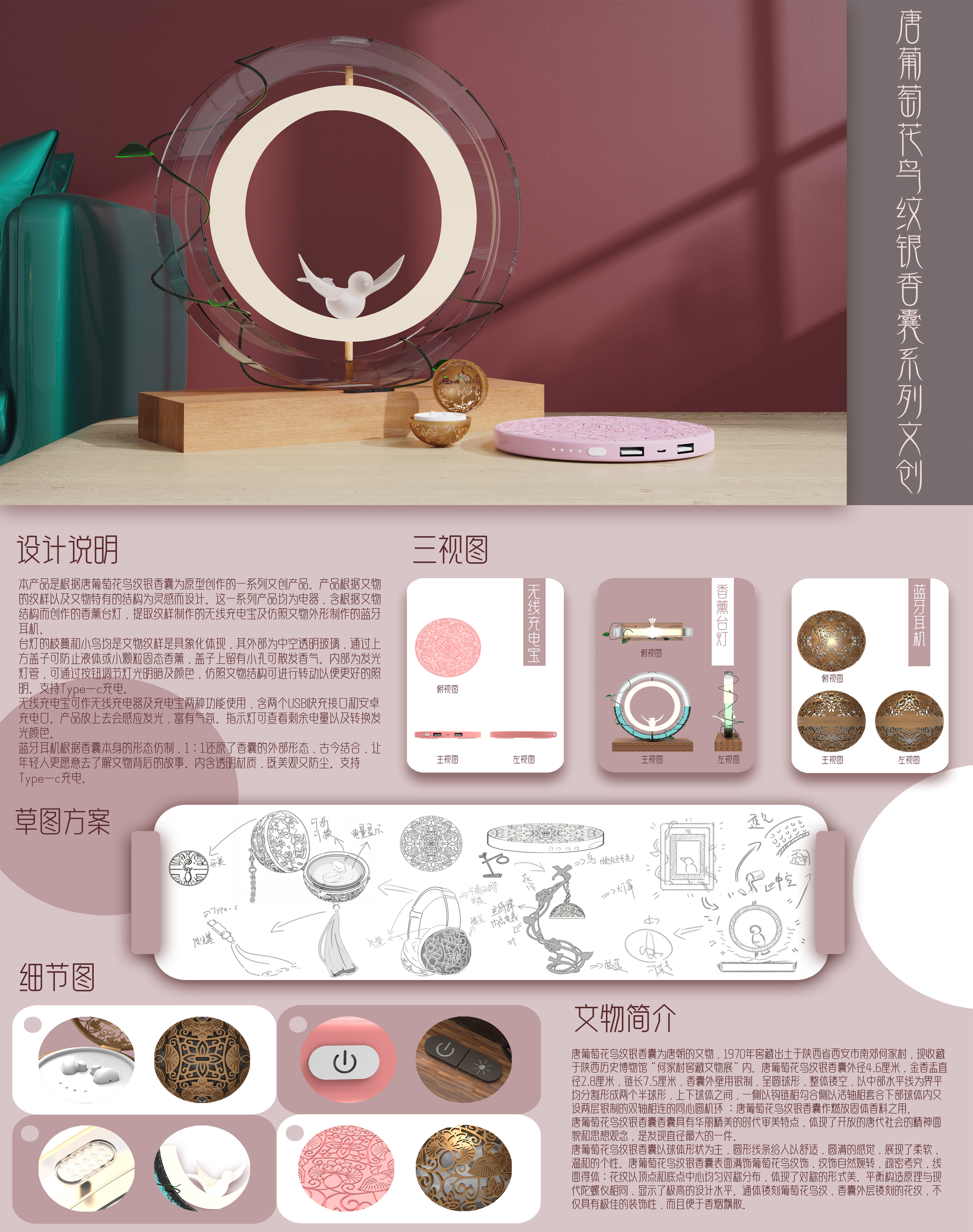 本产品是根据唐葡萄花鸟纹银香囊为原型创作的一系列文创产品。产品根据文物的纹样以及文物特有的结构为灵感而设计。根据文物结构而创作的香薰台灯,提取纹样制作的无线充电宝及仿照文物外形制作的蓝牙耳机。台灯的枝蔓和小鸟均是文物纹样是具象化体现,其外部为中空透明玻璃内部为发光灯管,仿照文物结构可进行转动。无线充电宝可作无线充电器及充电宝两种功能使用,产品放上去会感应发光。蓝牙耳机根据香囊本身的形态仿制。