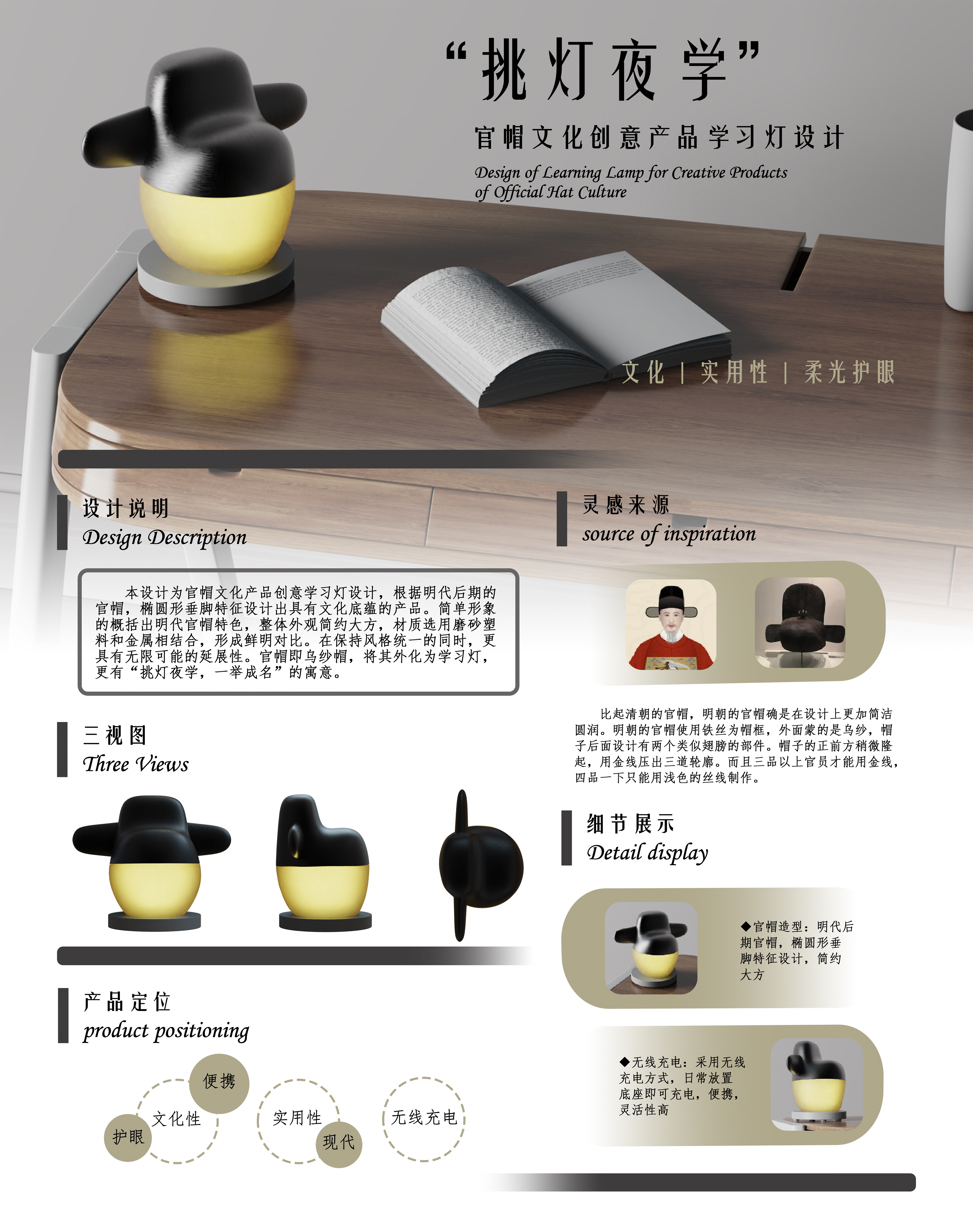 本设计为官帽文化产品创意学习灯设计,根据明代后期的官帽,椭圆形垂脚特征设计出具有文化底蕴的产品。简单形象的概括出明代官帽特色,整体外观简约大方,材质选用磨砂塑料和金属相结合,形成鲜明对比。在保持风格统一的同时,更具有无限可能的延展性。官帽即乌纱帽,将其外化为学习灯,更有“挑灯夜学,一举成名”的寓意。