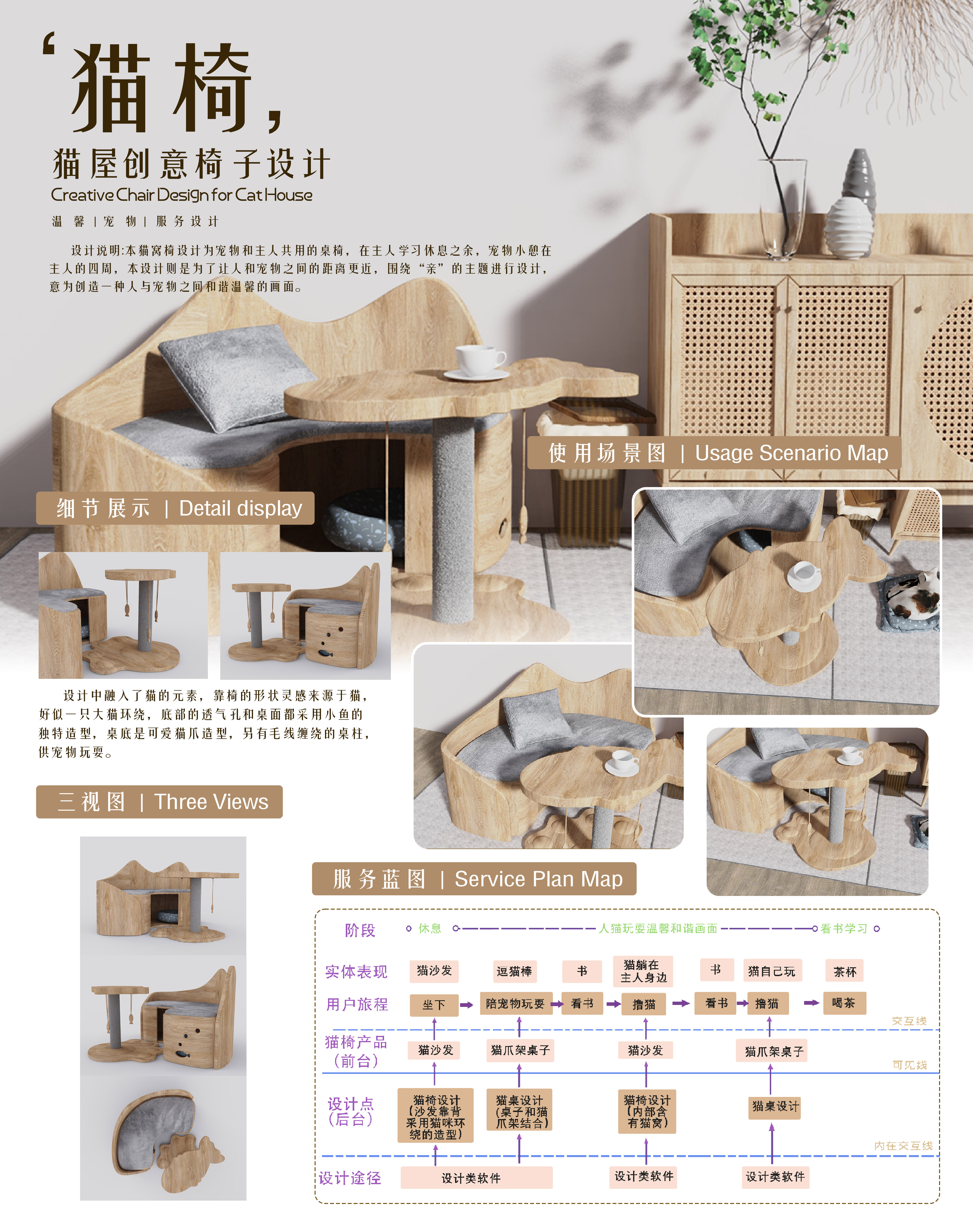 本猫窝椅设计为宠物和主人共用的桌椅,在主人学习休息之余,宠物小想在主人的四周,本设计则是为了让人和宠物之间的距离更近,围绕“亲”的主题进行设计.意为创造一种人与宠物之间和谐温馨的画面。设计中融入了猫的元素,靠椅的形状灵感来源于猫好似一只大猫环绕,底部的透气 孔和桌面都采用小鱼的独特造型,桌底是可爱猫爪造型,另有毛线缠绕的桌柱供宠物玩耍。