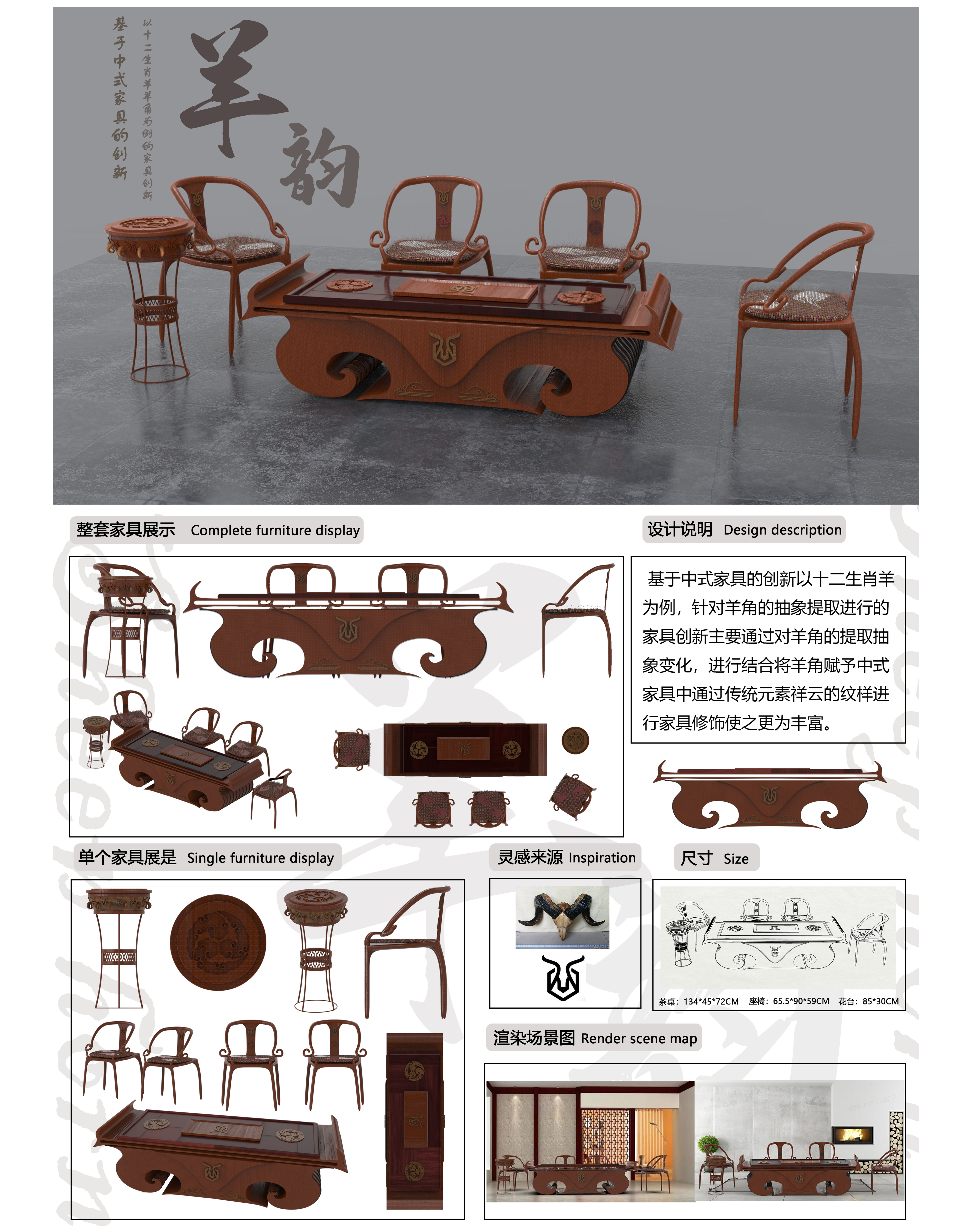 基于中式家具的创新,以十二生肖中的羊为例,针对羊角的抽象提取进行的家具创新主要通过对羊角的提取抽象变化,进行结合将羊角赋予中式家具中通过传统元素祥云的纹样进行家具修饰使之更为丰富。