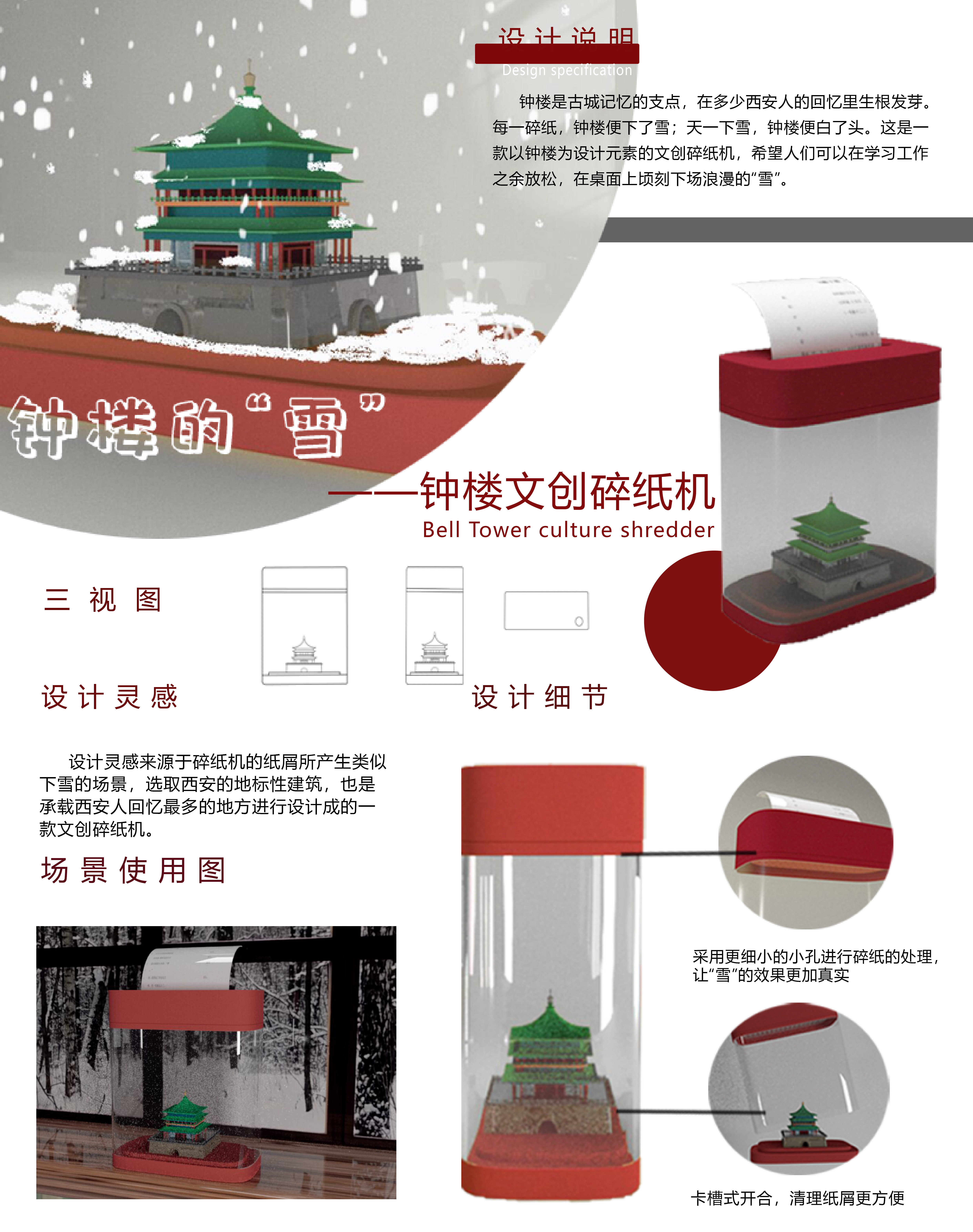 钟楼是古城记忆的支点,在多少西安人的回忆里生根发芽每一碎纸,钟楼便下了雪;天一下雪,钟楼便白了头。这是一款以钟楼为设计元素的文创碎纸机,希望人们可以在学习工作之余放松,在桌面上顷刻下场浪漫的“雪”。设计灵感来源于碎纸机的纸屑所产生类似下雪的场景,选取西安的地标性建筑,也是承载西安人回忆最多的地方进行设计成的一款文创碎纸机。