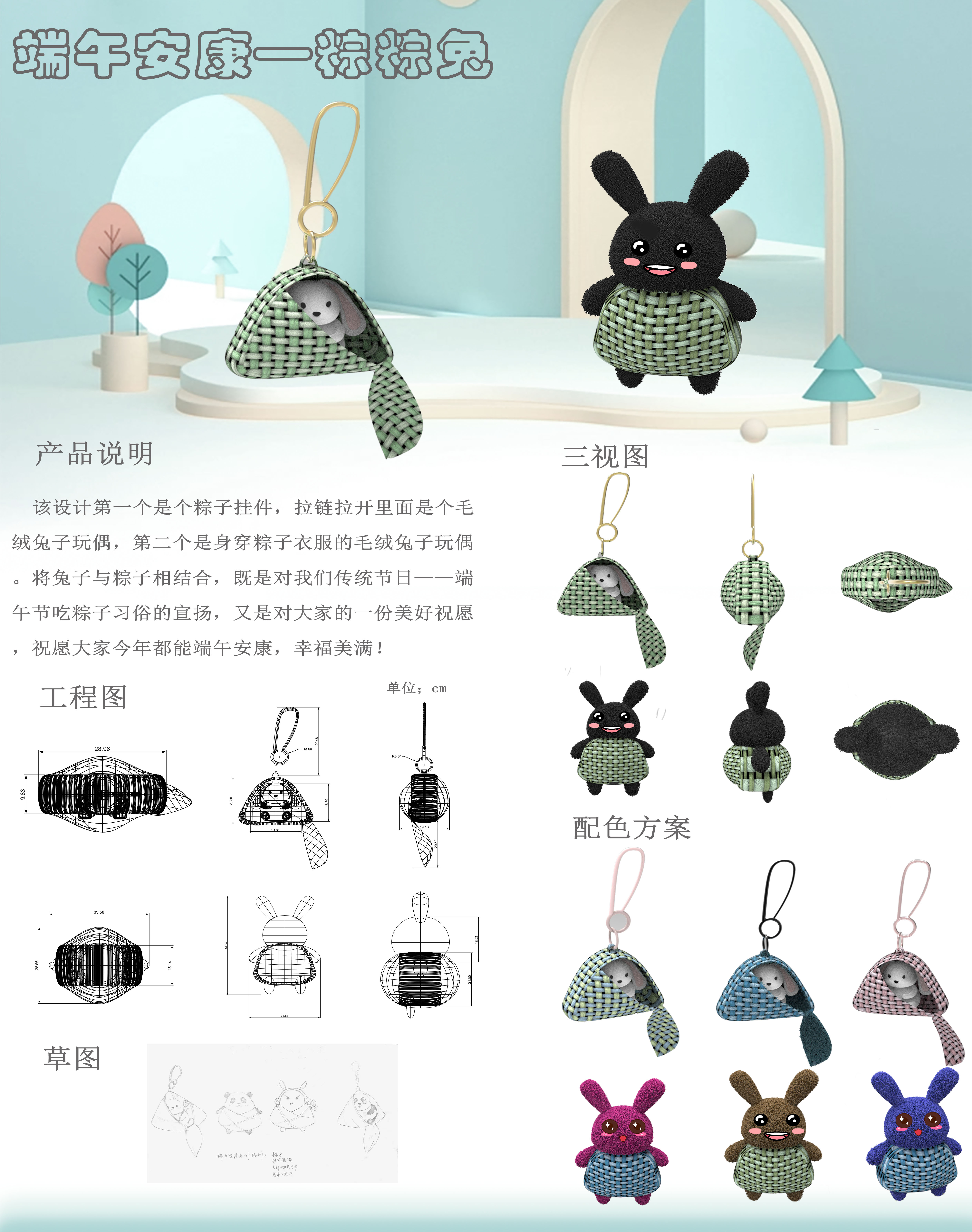 该设计第一个是个粽子挂件,拉链拉开里面是个毛绒兔子玩偶,第二个是身穿粽子衣服的毛绒兔子玩偶。将兔子与粽子相结合,既是对我们传统节日——端午节吃粽子习俗的宣扬,又是对大家的一份美好祝愿,祝愿大家今年都能端午安康,幸福美满!