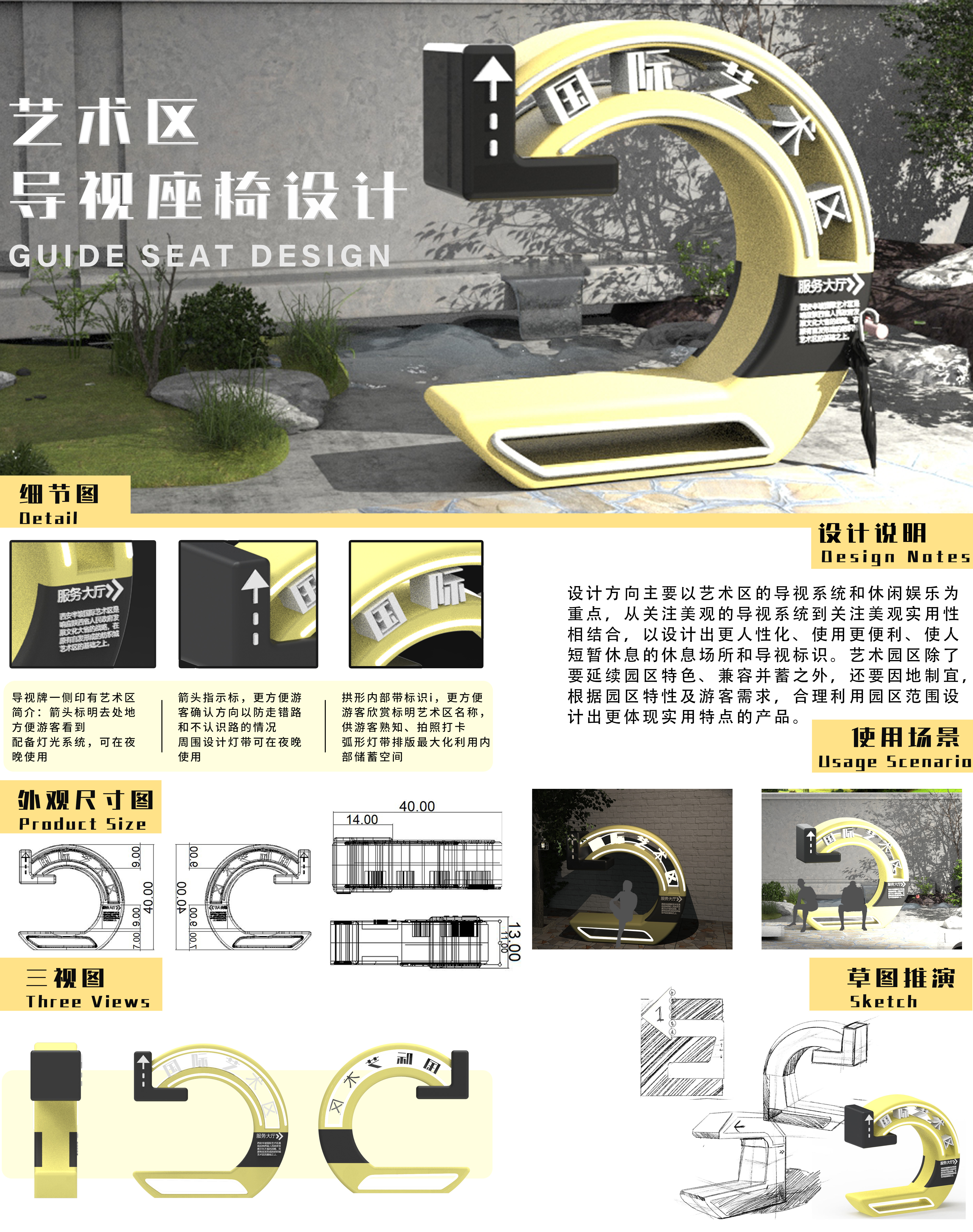 设计方向主要以艺术区的导视系统和休闲娱乐为重点,从关注美观的导视系统到关注美观实用性相结合,以设计出更人性化、使用更便利、使人短暂休息的休息场所和导视标识。艺术园区除了要延续园区特色、兼容并蓄之外,还要因地制宜,根据园区特性及游客需求,合理利用园区范围设计出更体现实用特点的产品。