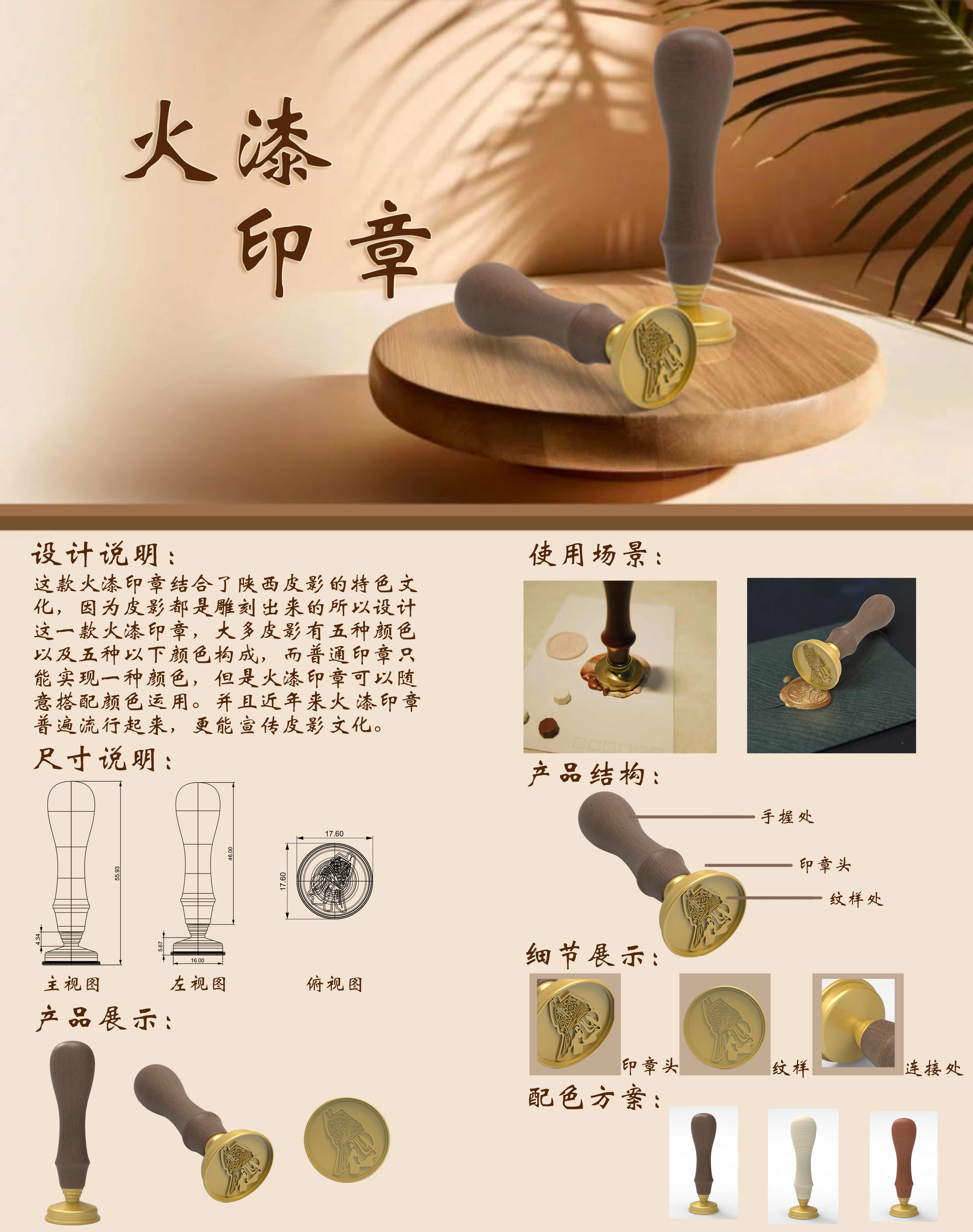 这款火漆印章结合了陕西皮影的特色文化,因为皮影都是雕刻出来的所以设计这一款火漆印章,大多皮影有五种颜色以及五种以下颜色构成,而普通印章只能实现一种颜色,但是火漆印章可以随意搭配颜色运用。并且近年来火 漆印章普遍流行起来,更能宣传皮影文化。