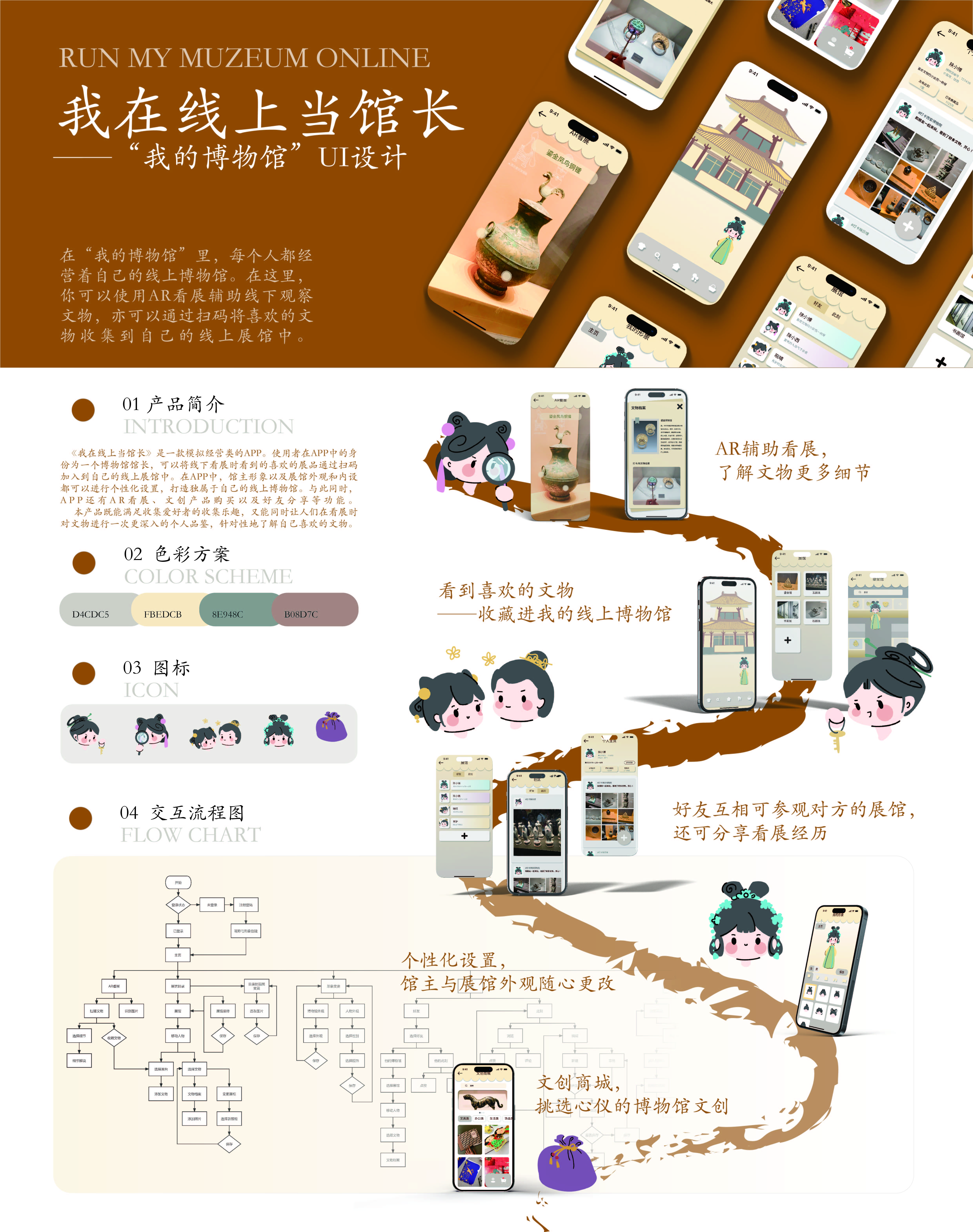 《我在线上当馆长》是一款模拟经营类的APP文创。使用者在其中的身份为博物馆馆长,可以将线下看展时看到的喜欢的展品通过扫描识别加入到自己的线上展馆中。馆主形象以及展馆外观和内设都可以进行个性化设置,打造独属于自己的线上博物馆。与此同时,APP还有AR看展、文创商城以及好友分享等功能。 既能满足收集爱好者的收集乐趣,又能同时让人们在看展时对文物进行一次更深入的个人品鉴,针对性地了解自己喜欢的文物。