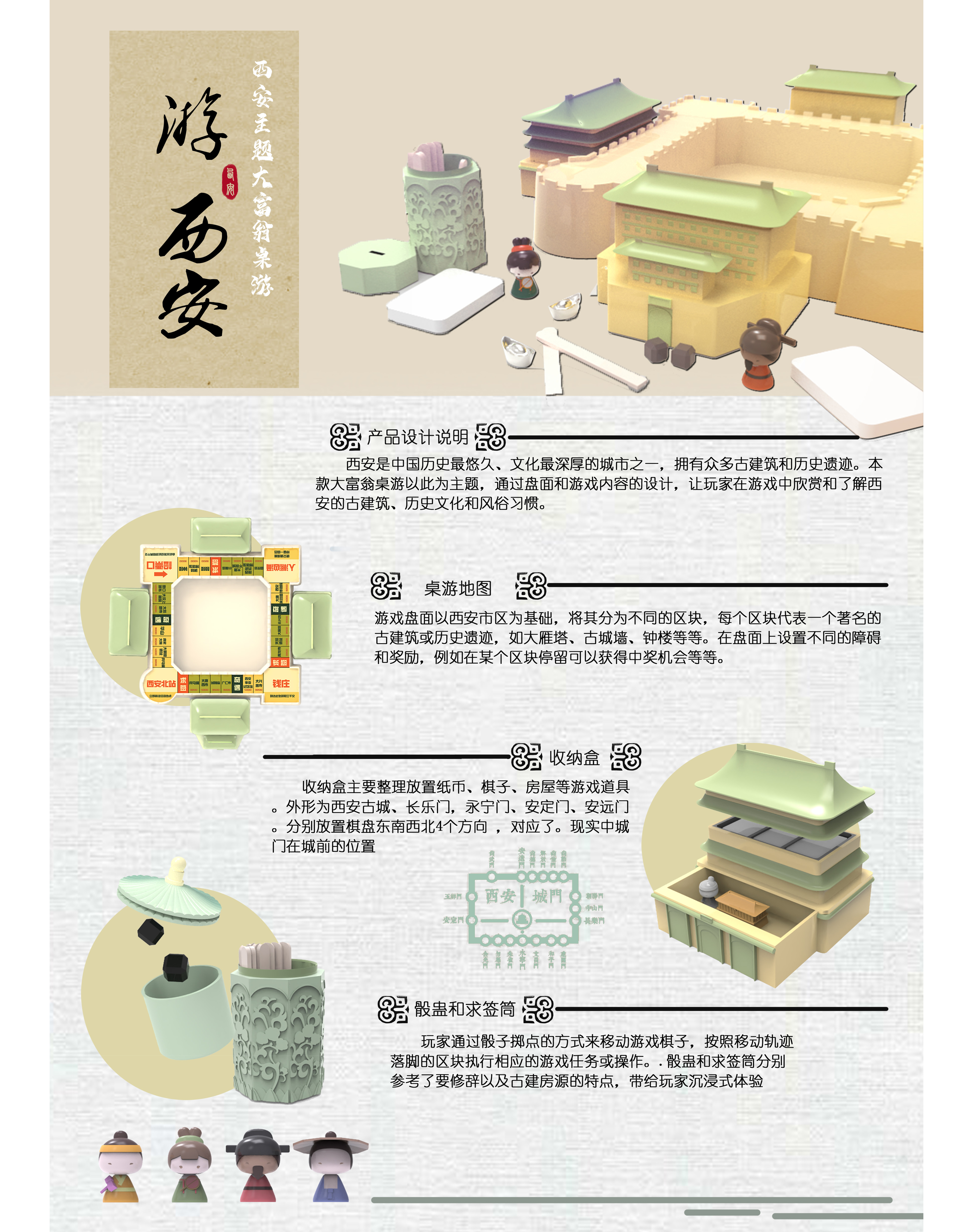 西安是中国历史最悠久、文化最深厚的城市之一,拥有众多古建筑和历史遗迹。本款大富翁桌游以此为主题,通过盘面和游戏内容的设计,让玩家在游戏中欣赏和了解西安的古建筑、历史文化和风俗习惯。