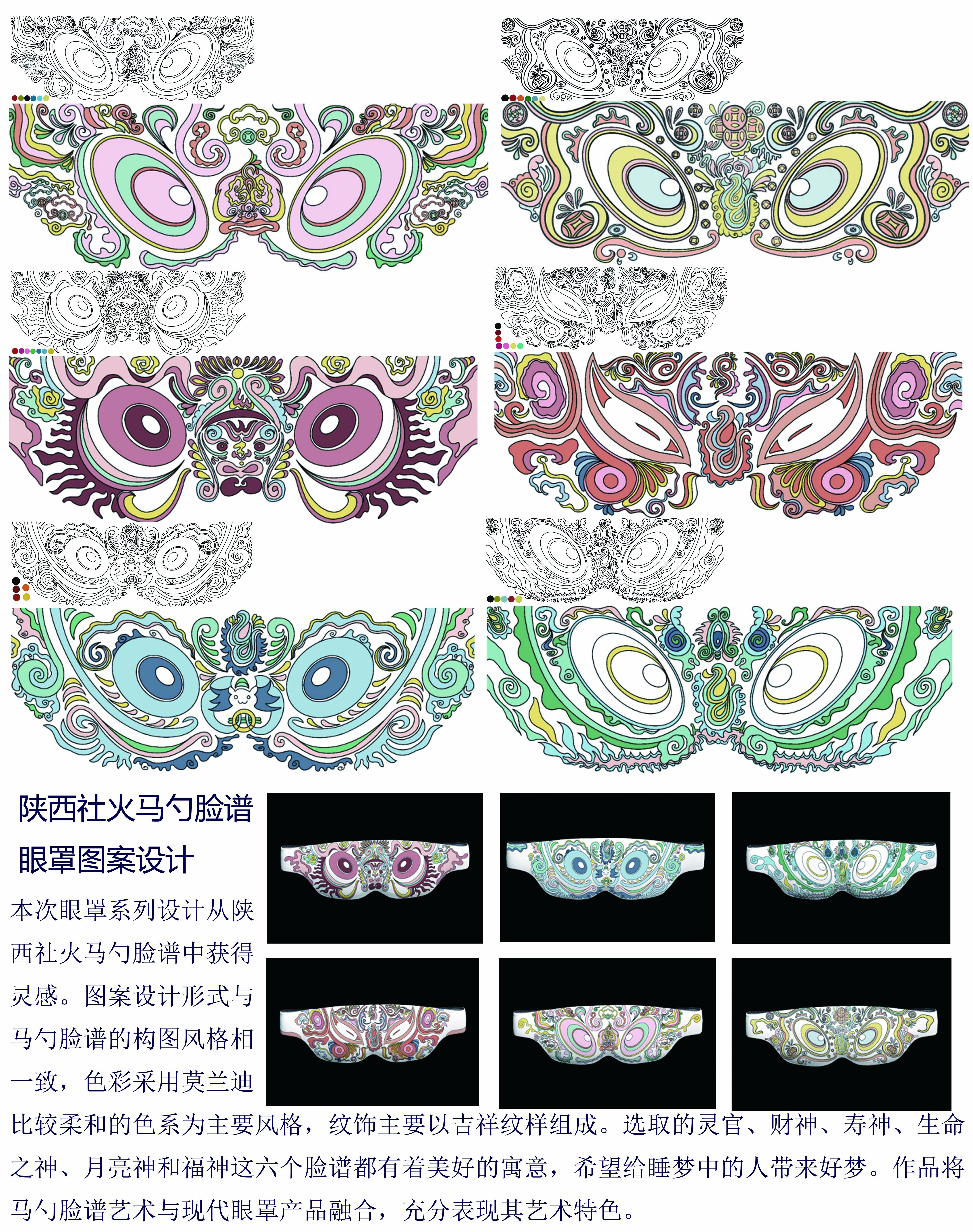本次眼罩系列设计从陕西社火马勺脸谱中获得灵感。图案设计形式与马勺脸谱的构图风格相一致,色彩采用莫兰迪比较柔和的色系为主要风格,纹饰主要以吉祥纹样组成。选取的灵官、财神、寿神、生命之神、月亮神和福神这六个脸谱都有着美好的寓意,希望给睡梦中的人带来好梦。作品采用对称的构图手法进行图案设计及应用,将马勺脸谱艺术与现代眼罩产品融合,充分表现其艺术特色。