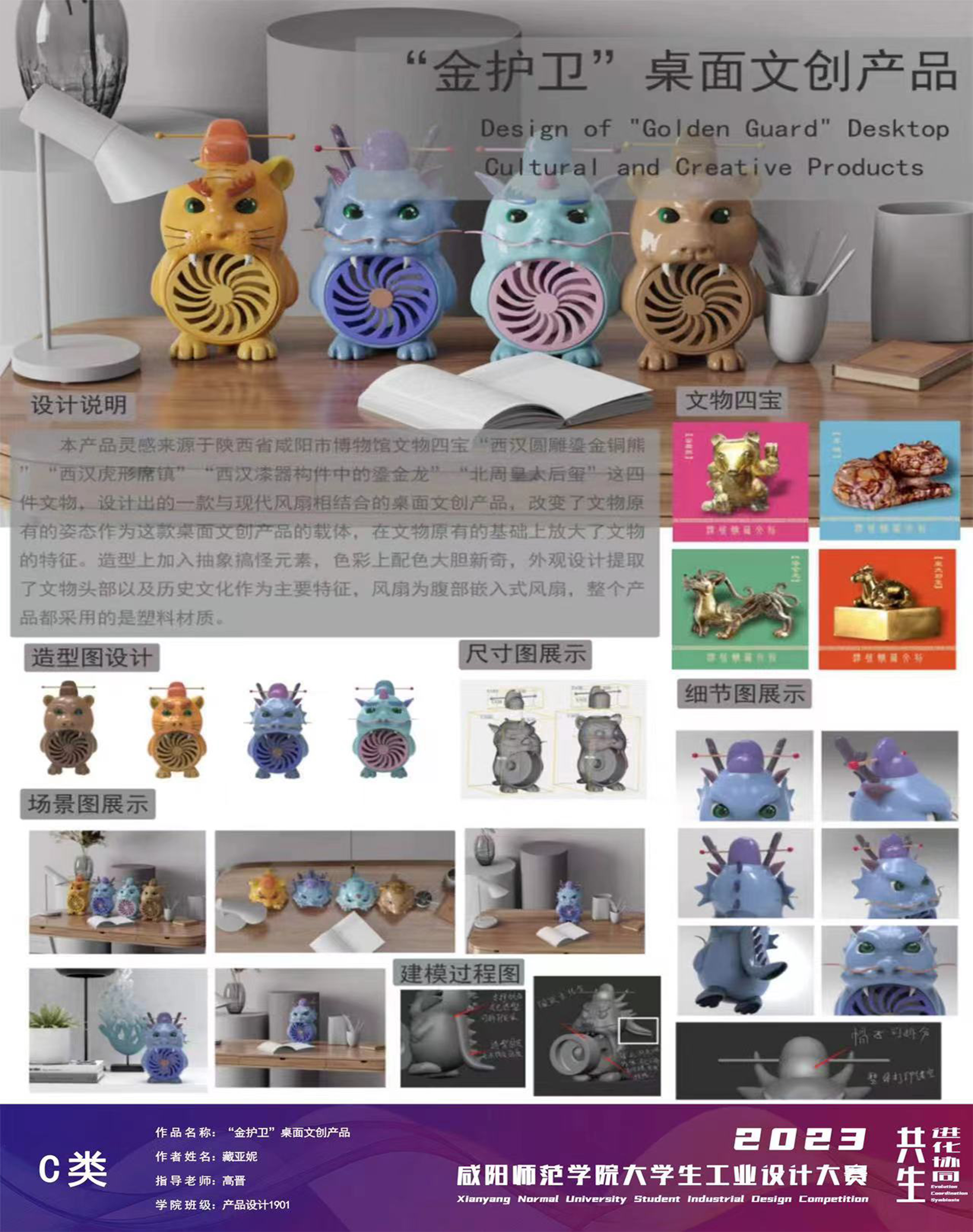 本产品灵感来源于陕西省咸阳市博物馆文物四宝“西汉圆雕鎏金铜熊”“西汉虎形席镇”“西汉漆器构件中的鎏金龙”“北周皇太后玺”这四件文物,设计出的一款与现代风扇相结合的桌面文创产品,改变了文物原有的姿态作为这款桌面文创产品的载体,在文物原有的基础上放大了文物的特征。造型上加入抽象搞怪元素,色彩上配色大胆新奇,外观设计提取了文物头部以及历史文化作为主要特征,风扇为腹部嵌入式风扇,整个产品都采用的是塑料材质