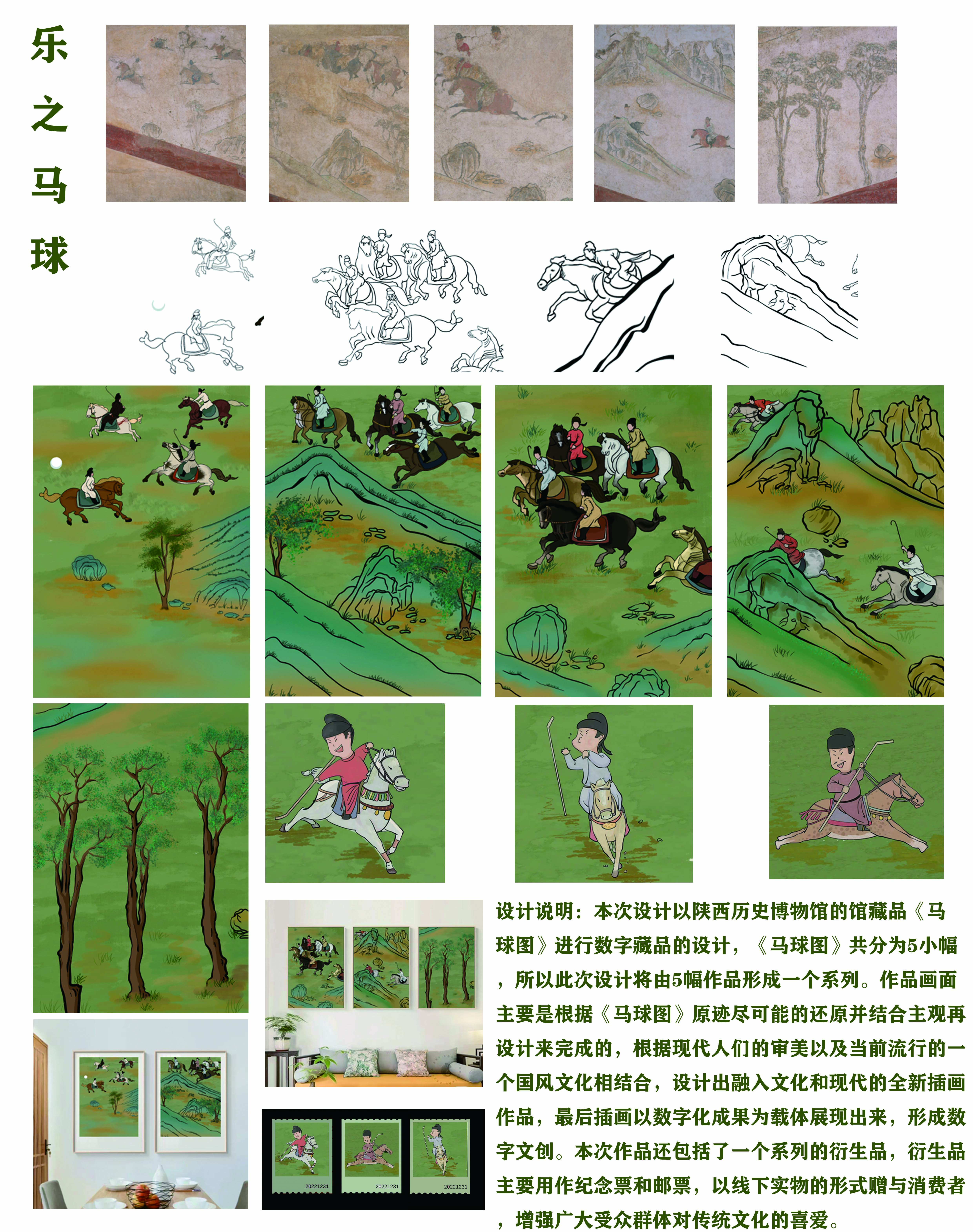 本次数字藏品设计来源于陕西历史博物馆的馆藏品《马球图》,此次设计将由5幅作品形成一个系列。作品画面主要是根据《马球图》原迹尽可能的还原并结合主观再设计来完成的,结合现代流行的国风文化,设计出融入文化的现代插画作品,最后以数字化成果为载体展现出来,形成数字文创。本次作品还包括了一个系列的衍生品,主要用作纪念票和邮票,以线下实物的形式赠与消费者,使传播形式更多样化,增强广大受众群体对传统文化的喜爱。