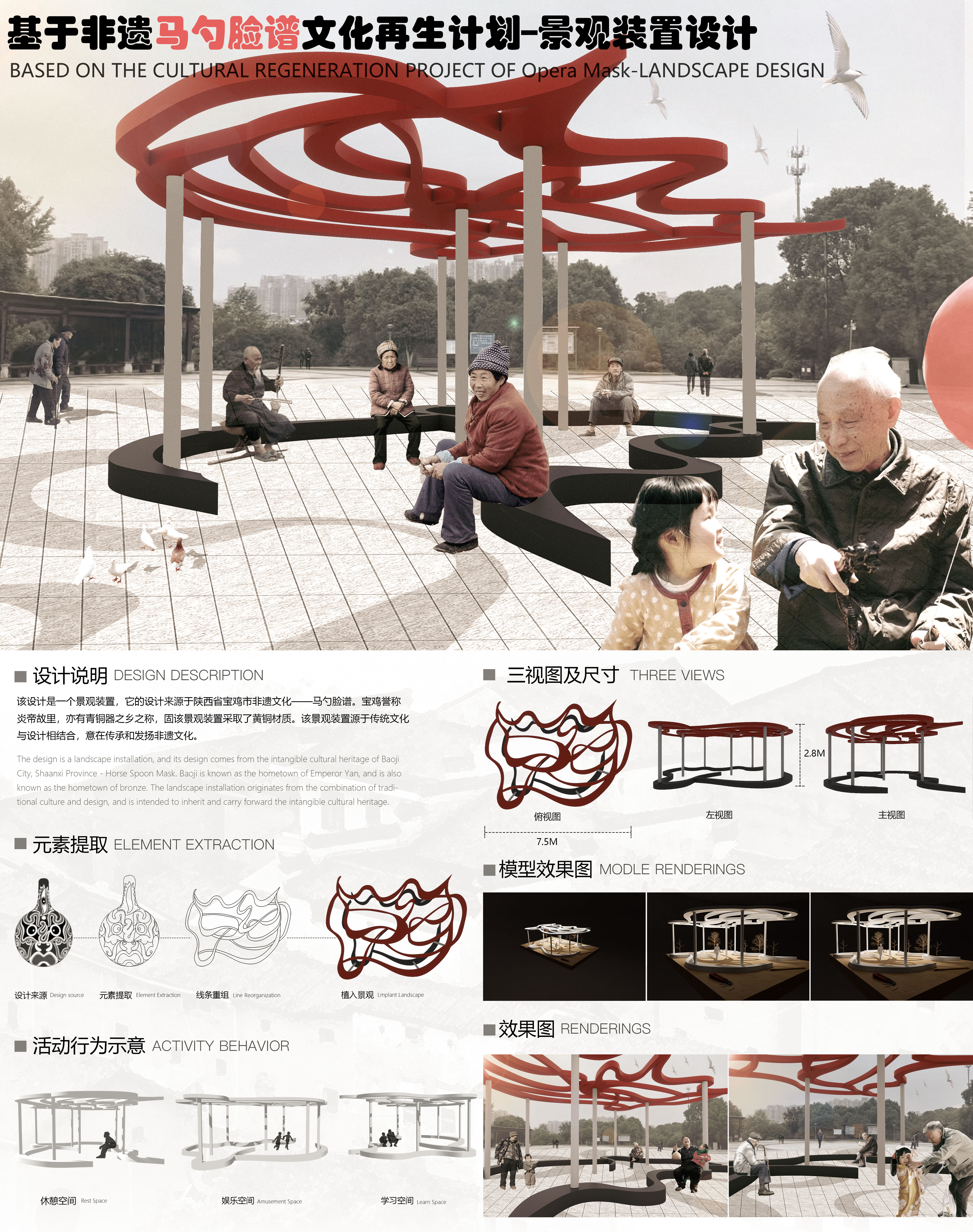 该设计是一个景观装置,它的设计来源于陕西省宝鸡市非遗文化——马勺脸谱。宝鸡誉称炎帝故里,亦有青铜器之乡之称,固该景观装置采取了黄铜材质。该景观装置源于传统文化与设计相结合,意在传承和发扬非遗文化。