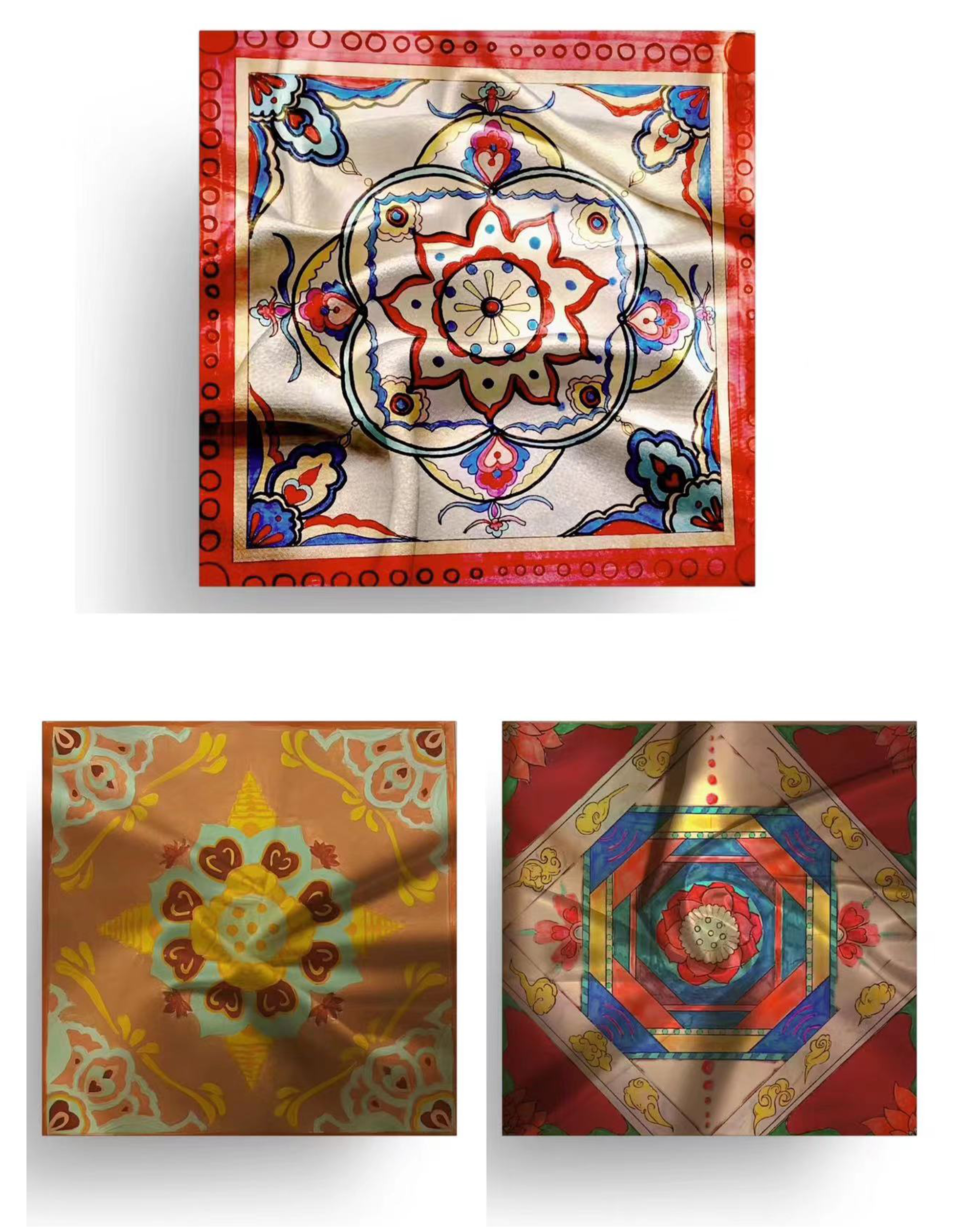 丝巾由七个层次构成,层层递进,灵感来自于大雁塔的七层塔身。七层是大雁塔的最高点,向四周眺望,古都四方四景一览无遗。最高层刻着莲花图案的藻井,雕刻精细,栩栩如生象征着女性的纯洁和慈悲。丝巾以莲花为中心展开, 外部呈八角形,中心呈圆形,象征天地之间宇宙形态。整体颜色丰富了画面的韵味,提高色彩饱和度使画面更加鲜明。使用中国风的设计风格表现大雁塔的文化,利用祥云纹,卷草纹等中国传统元素表达美好吉祥的寓意